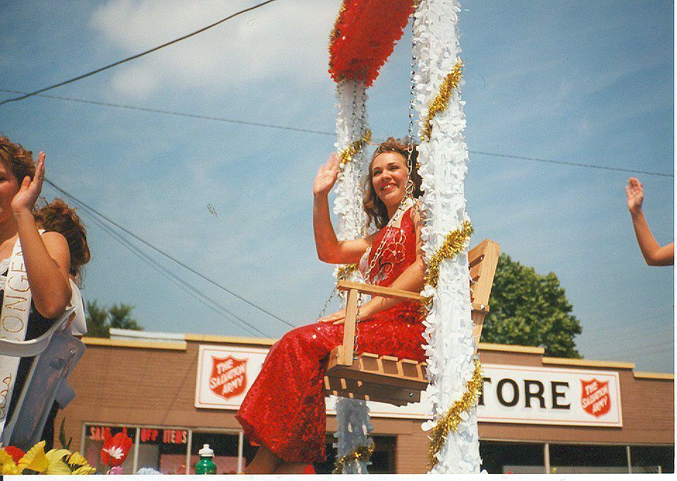 3.5" x 5" color, glossy photo in landscape format. Image shows the Bears of Blue River Festival Queen sitting on a swing atop the "Queen Court" float. She wears a long red gown and waves to the crowd with her right hand. The Salvation Army Thrift Store is visible behind her.Collection