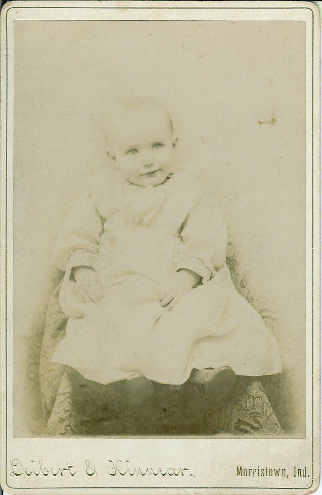 Carte-de-Visite photographic print of an infant sitting in a draped chair; wearing long white dress; shoe soles visible. Photographers mark: "Deibert & Kinnear, Morristown, Ind." Inscribed in ink on back: "Mamie Beaumont when a little girl."