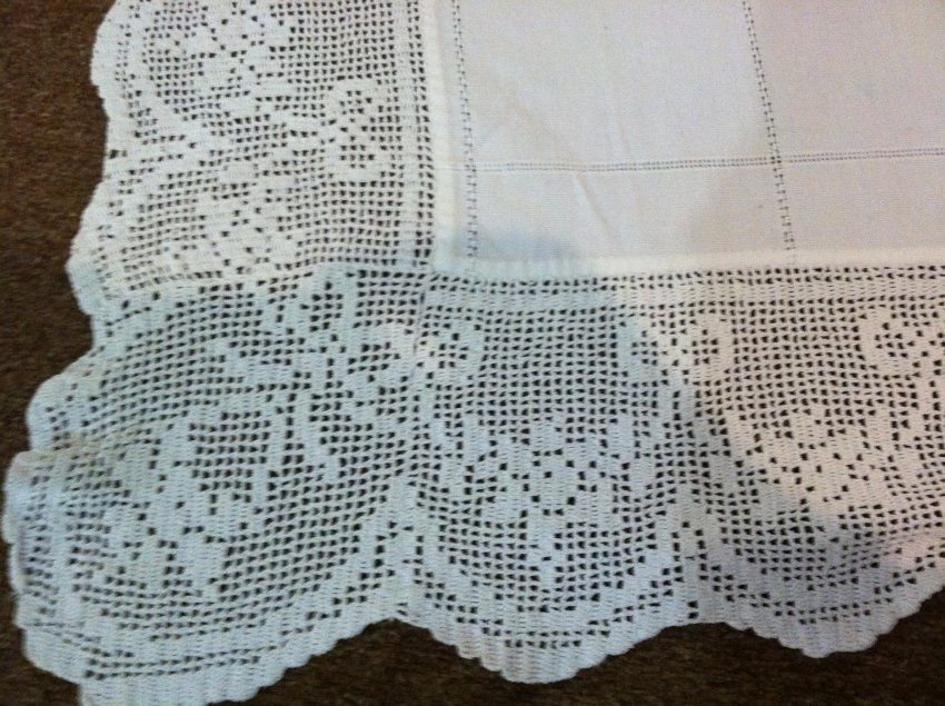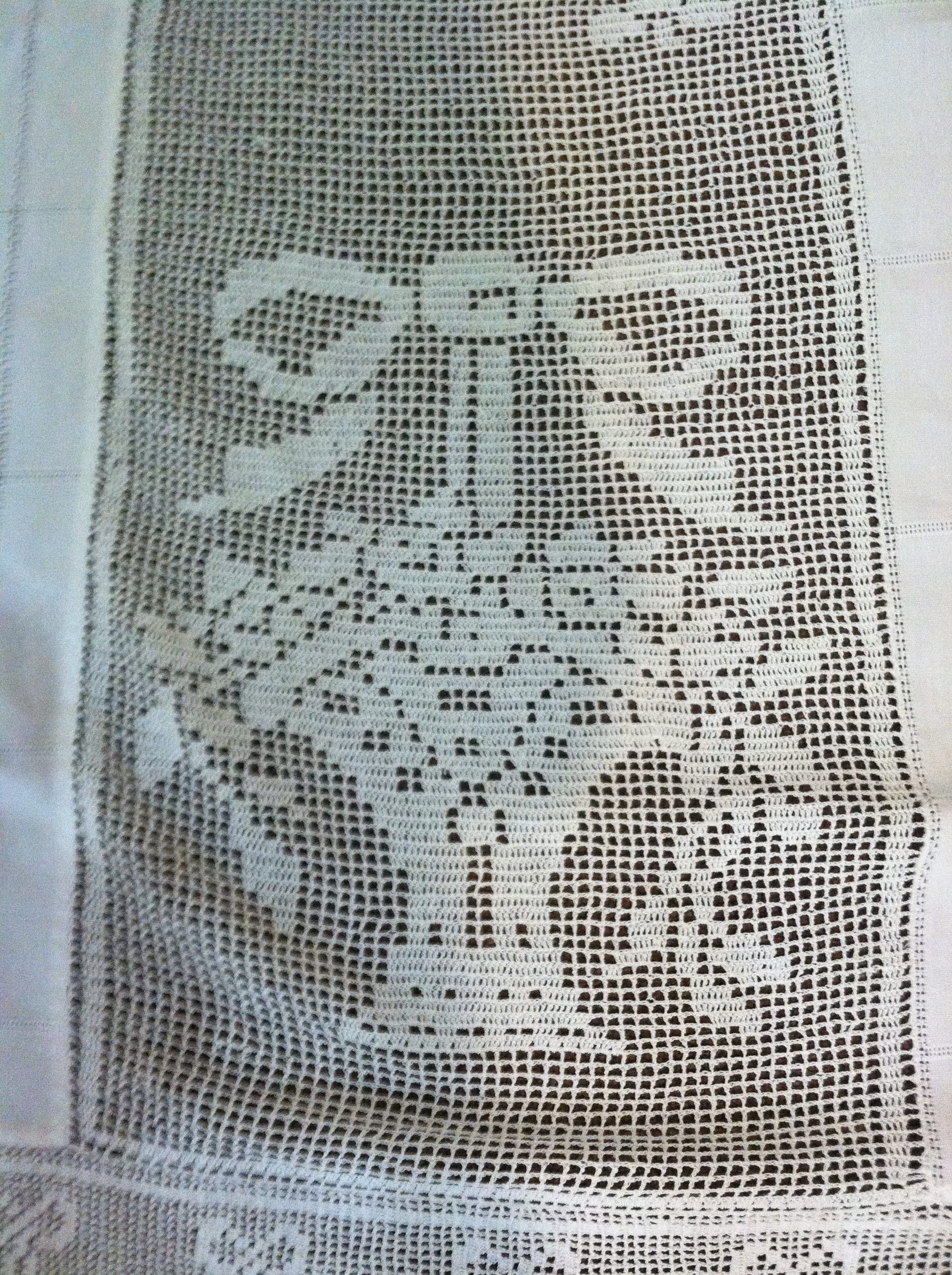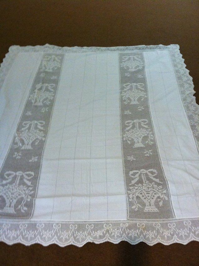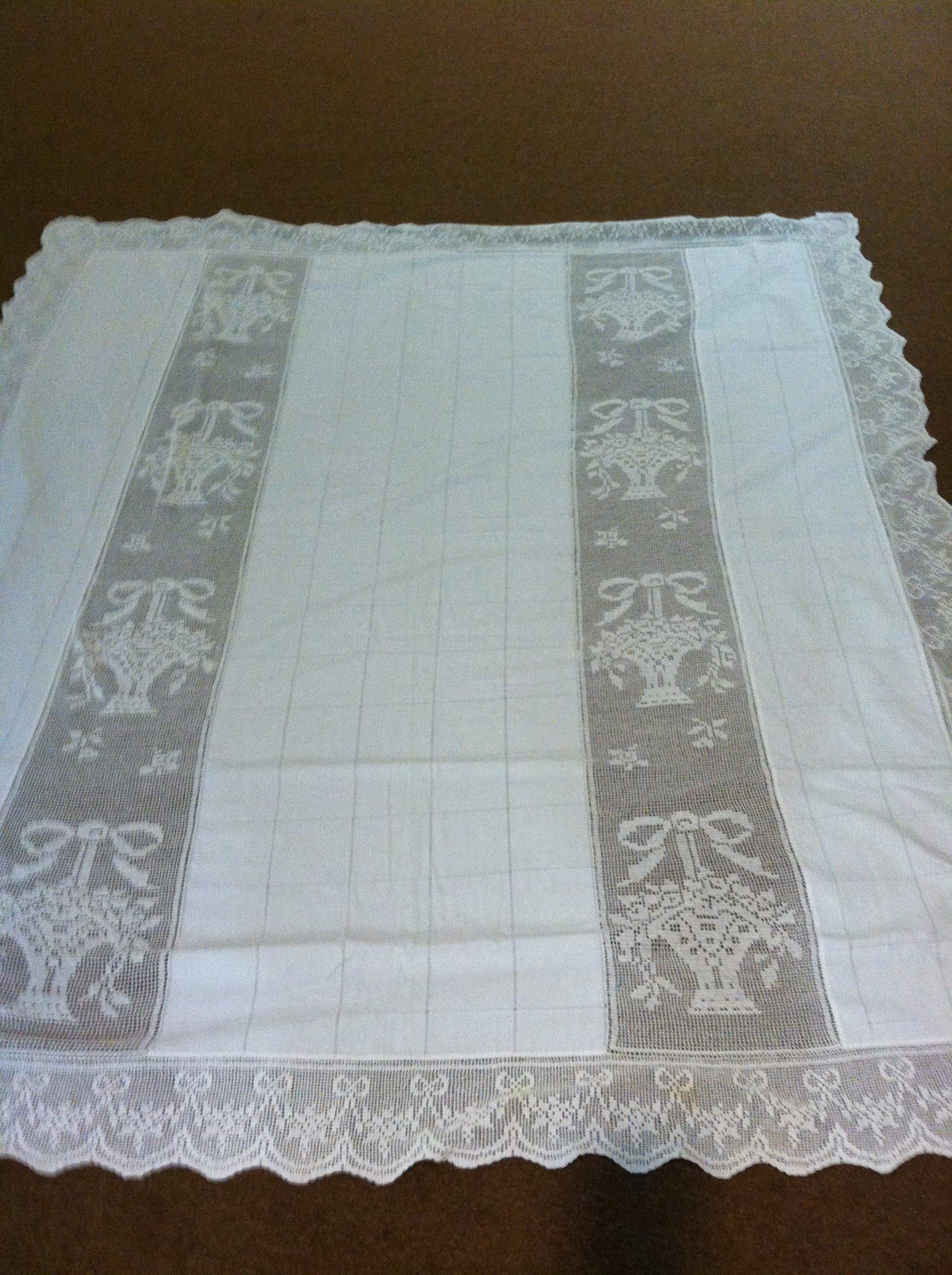 Hand-made bedspread of cotton muslin and cotton crochet panels. Cotton crochet border. Flower basket with ribbon pattern in the crochet. John Kemper dates it "1920s"Collection