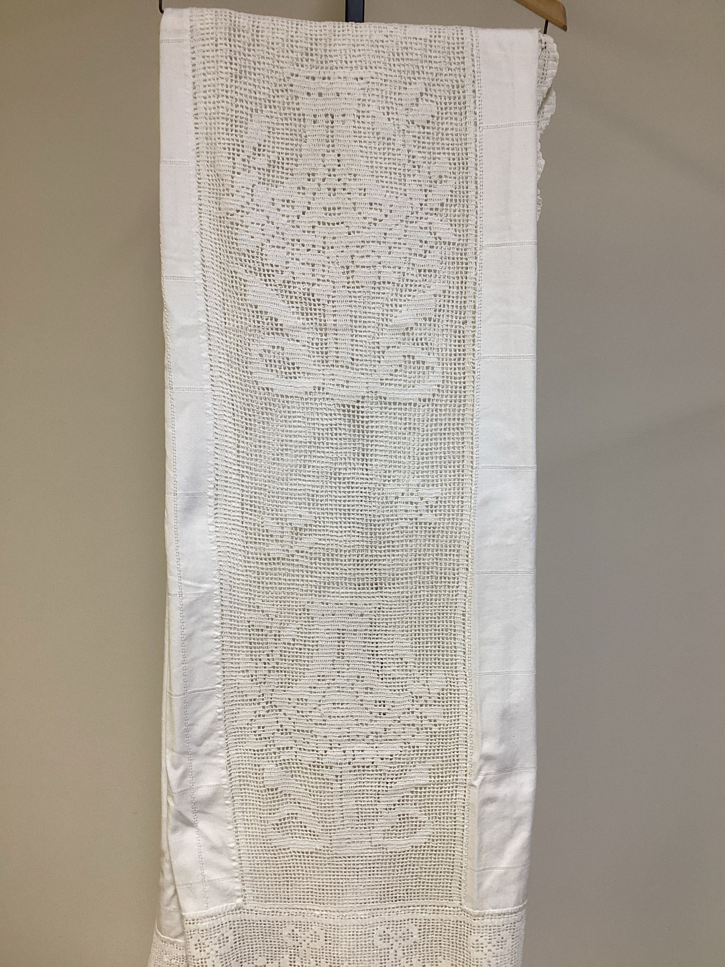 White crochet bedspread made by Ida Gustafson in 1920. Intricate panel in middle of cotton spread and scalloped crocheted edge.Textile Type