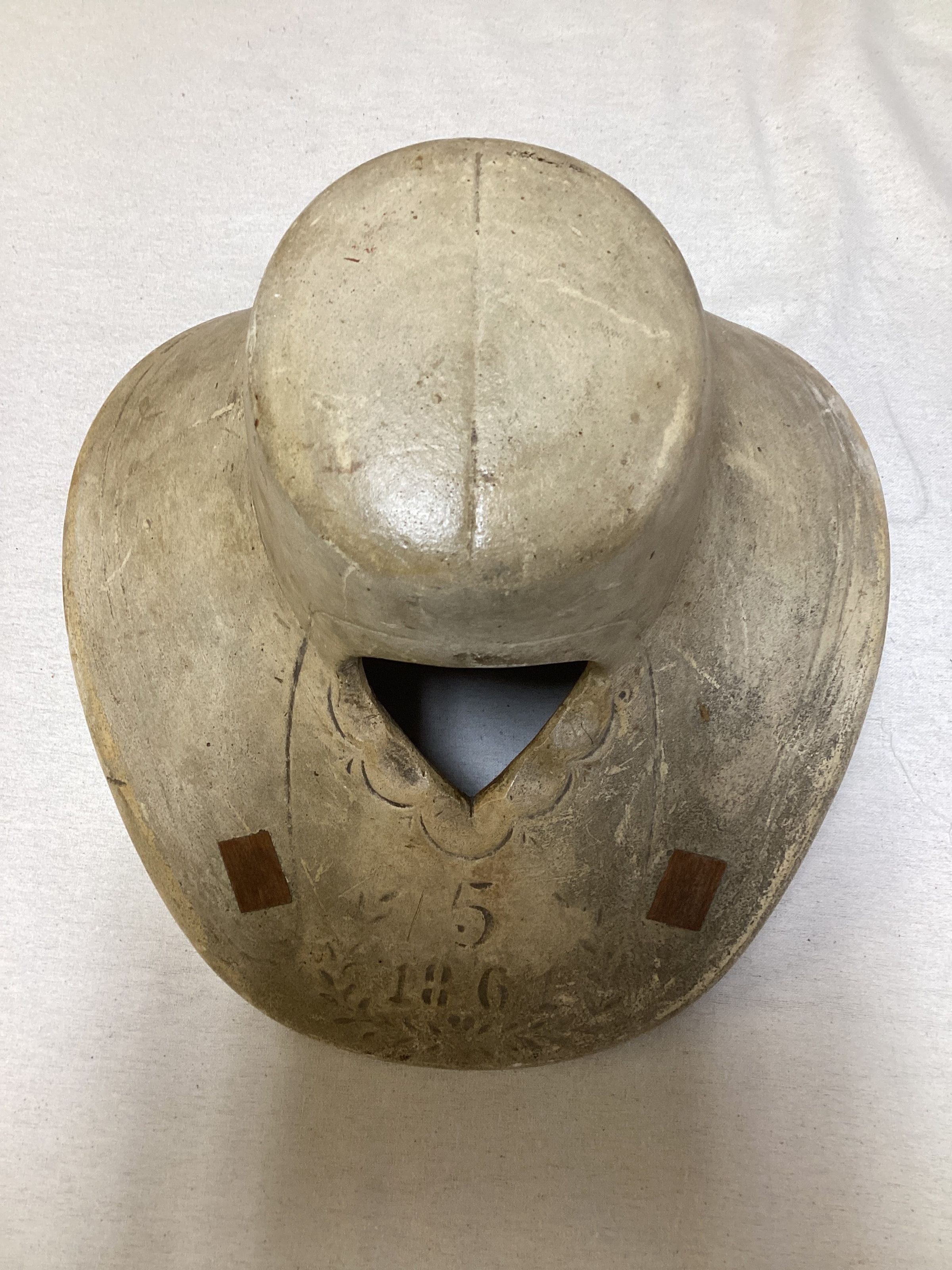 Creamy colored plastic hat mold- molded into the plaster is the shape of a collar with 2 wooden veneer rectangules at collar front and one at back of collar; there is a scalloped effect at trhoat a No., 5 and 1861 and is; encircled with "laurel leaf design"