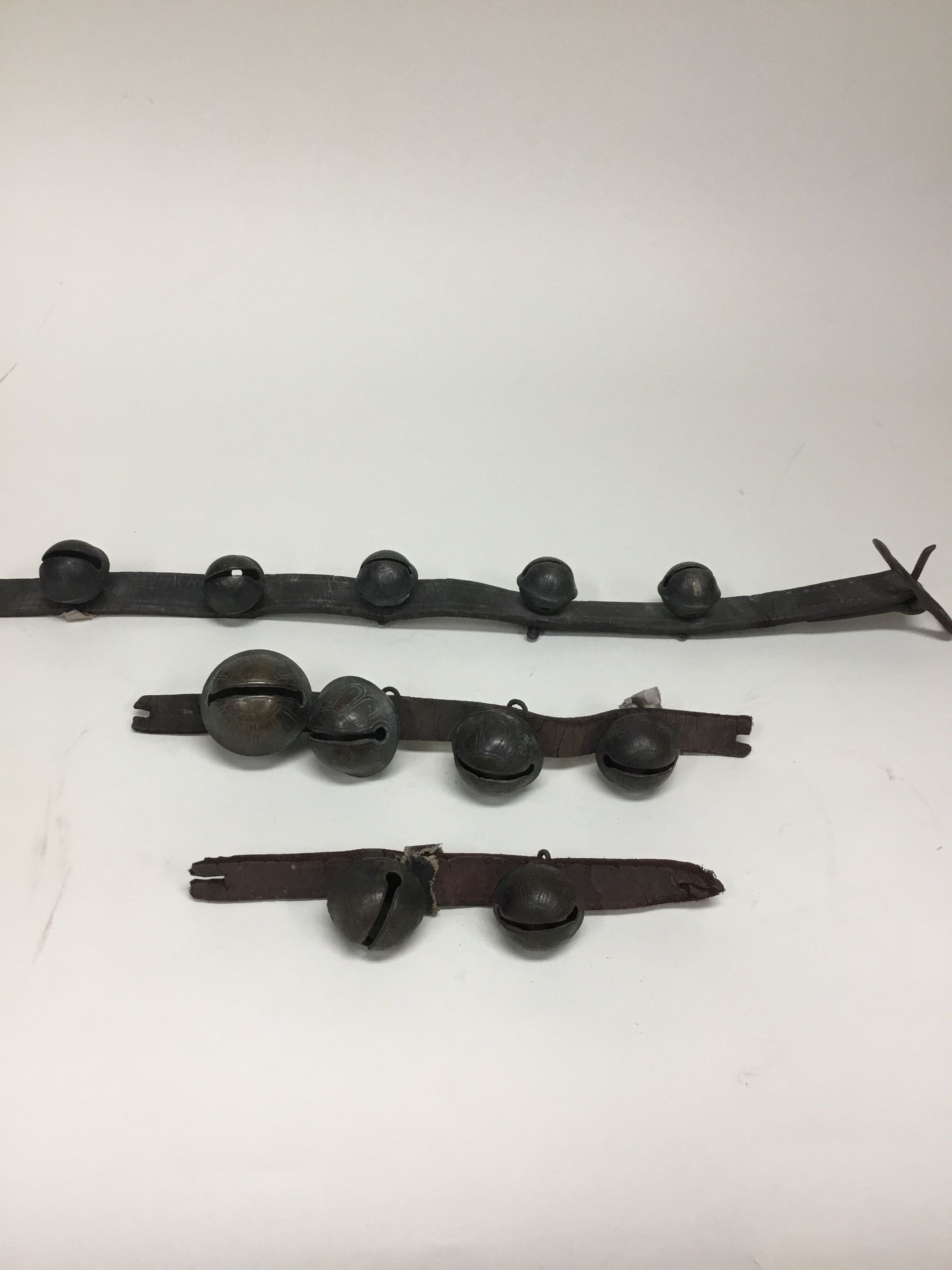 11 sleigh bells on two pieces of leather; one piece of leather is black has a buckle on one end and has 7 bells; other piece of leather is brown and has 2 bells and is tied to black leather; there is one bell tied to both ttrips so unsure where belongs; the bells have a ridge at their equator and four holes near base; above ridge are decorated with elongated horseshoe shapes joined at open end by two arcing lines; each has a slit on top for sounding and a number based on size of bell. Bells have extension at base sticking thru leather and secured by "8" shaped wire.