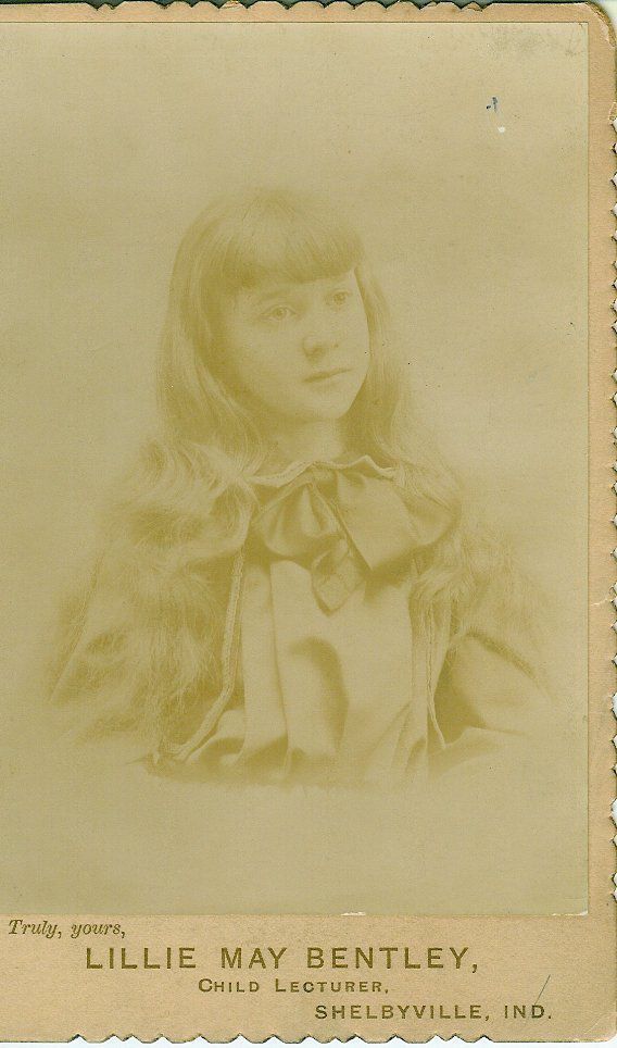 Black & White cabinet print ; image is young girl; upper torso shot; has long hair and bangs; face turned a little to the left; wearing long sleeved robe w/a wide ribbon bow; collar ripling and evidence of a cape on the left side; mount has scalloped edges; below print on mount is gold printing: Truly yours/Lillie May Bentley,/Child Lecturer, Shelbyville, Ind."