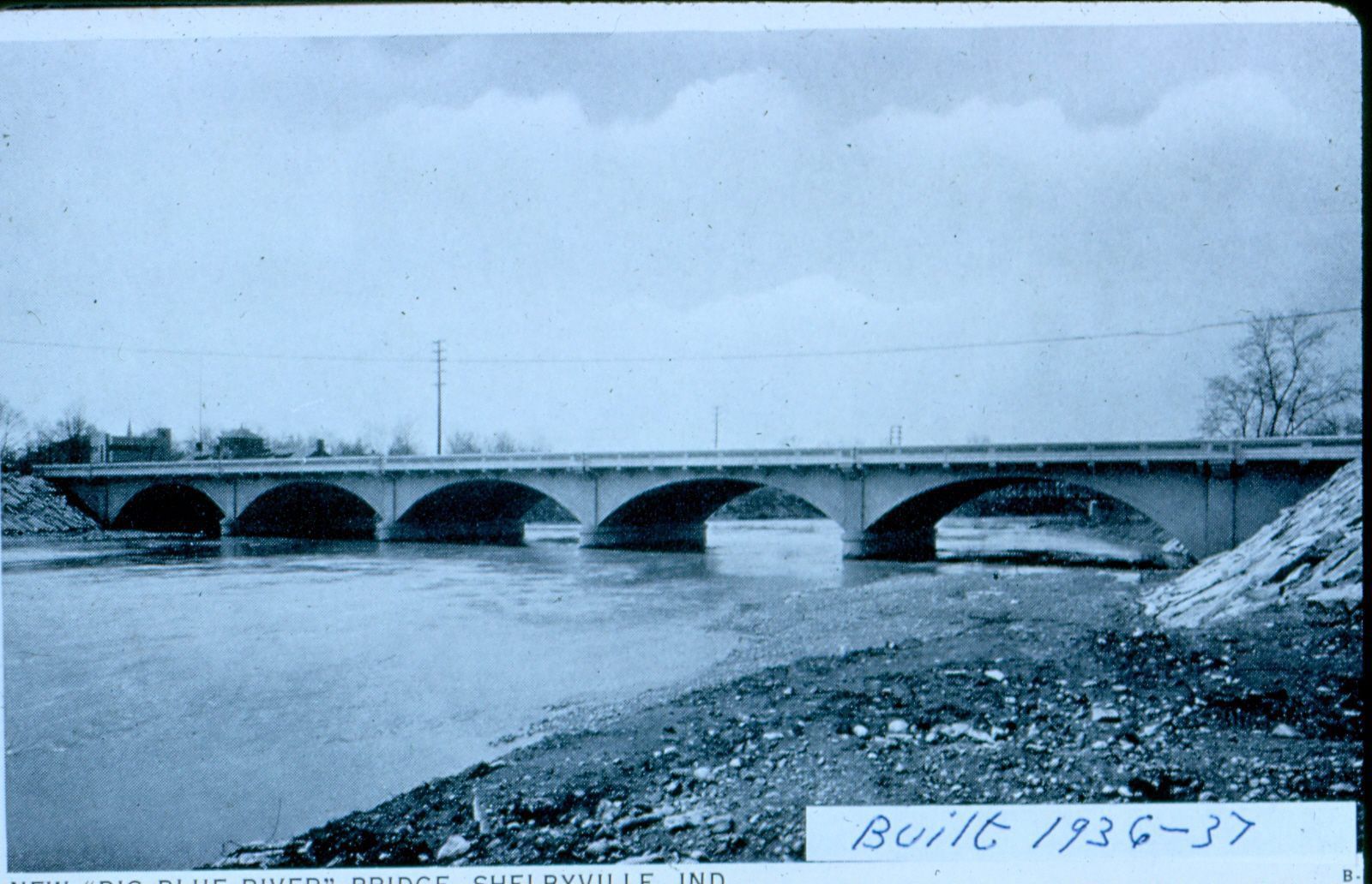 Donation, 07/26/2005. Black and white photographic slide in landscape format. Caption on picture: "New Big Blue River Bridge, Shelbyville, Ind./Built