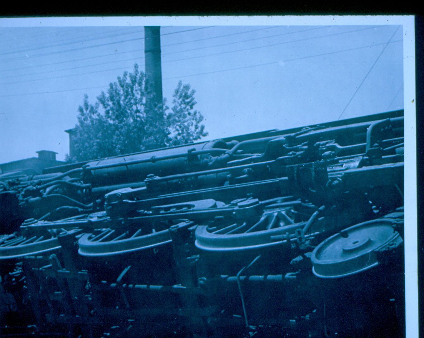 Donation, 07/26/2005. Black and white photographic slide in landscape format. This is a slide of a photograph. Slide frame is marked: "Derailed Big 4 Engine/at Vine Tower."Collection