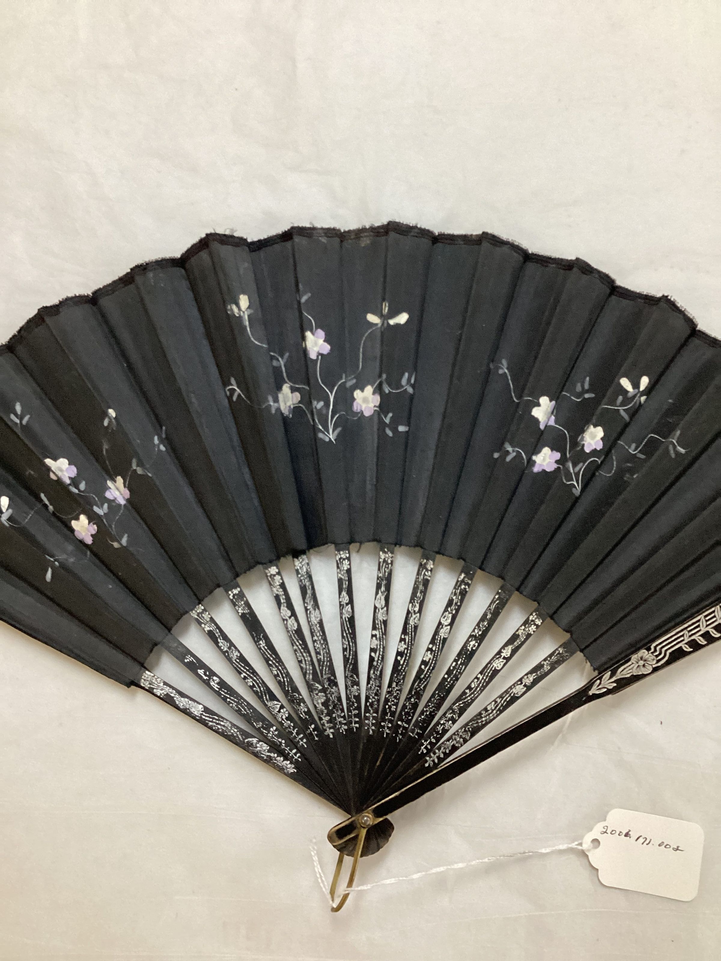 Folding fan, black wood spokes with silver painted leaves and flowers on the cloth on one side. Brass hook at the bottom. Reverse side is plain black.Use