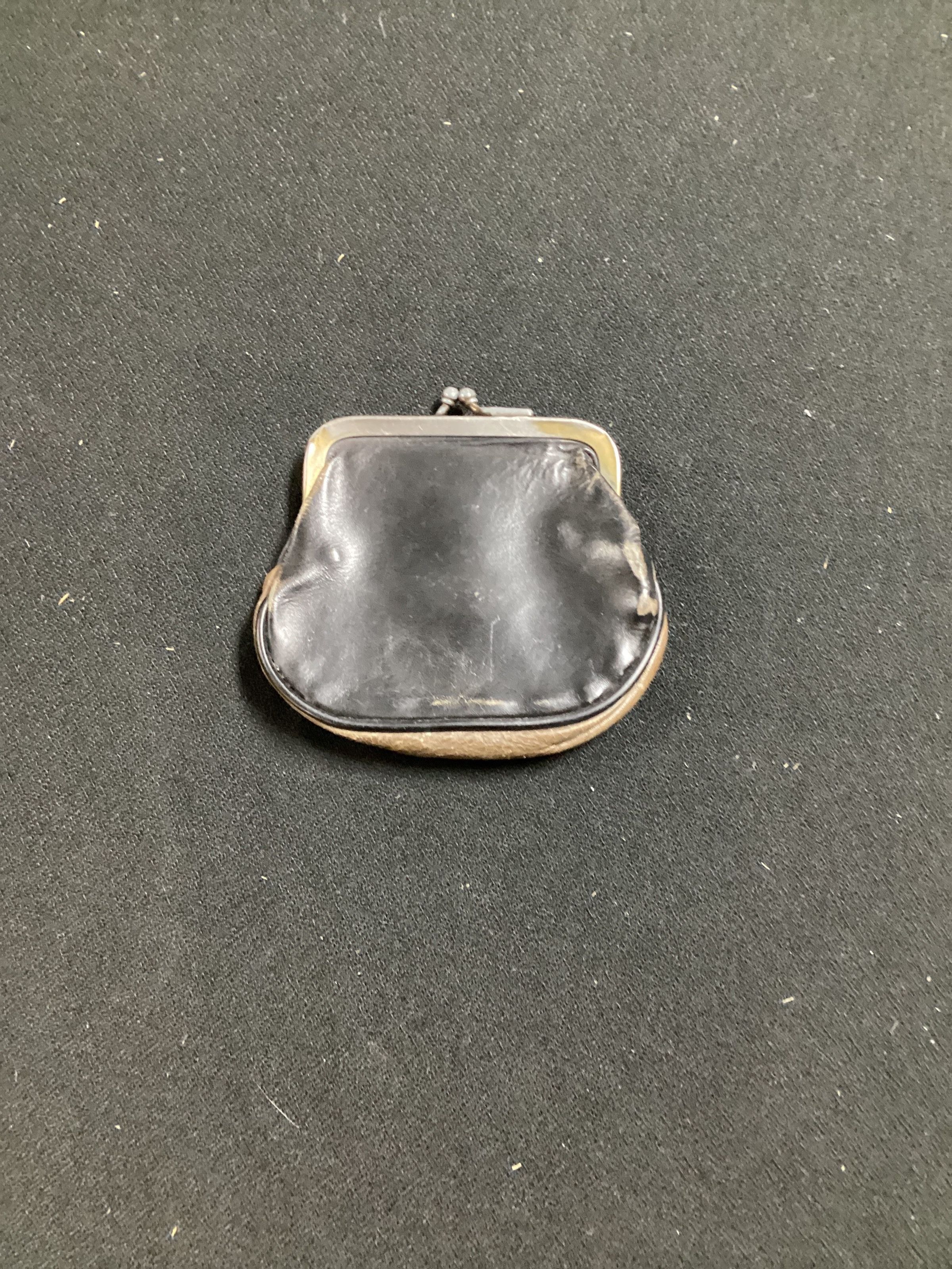 small coin purse, black leather with tan section at the base; purse fastened with metal snaps at topUse