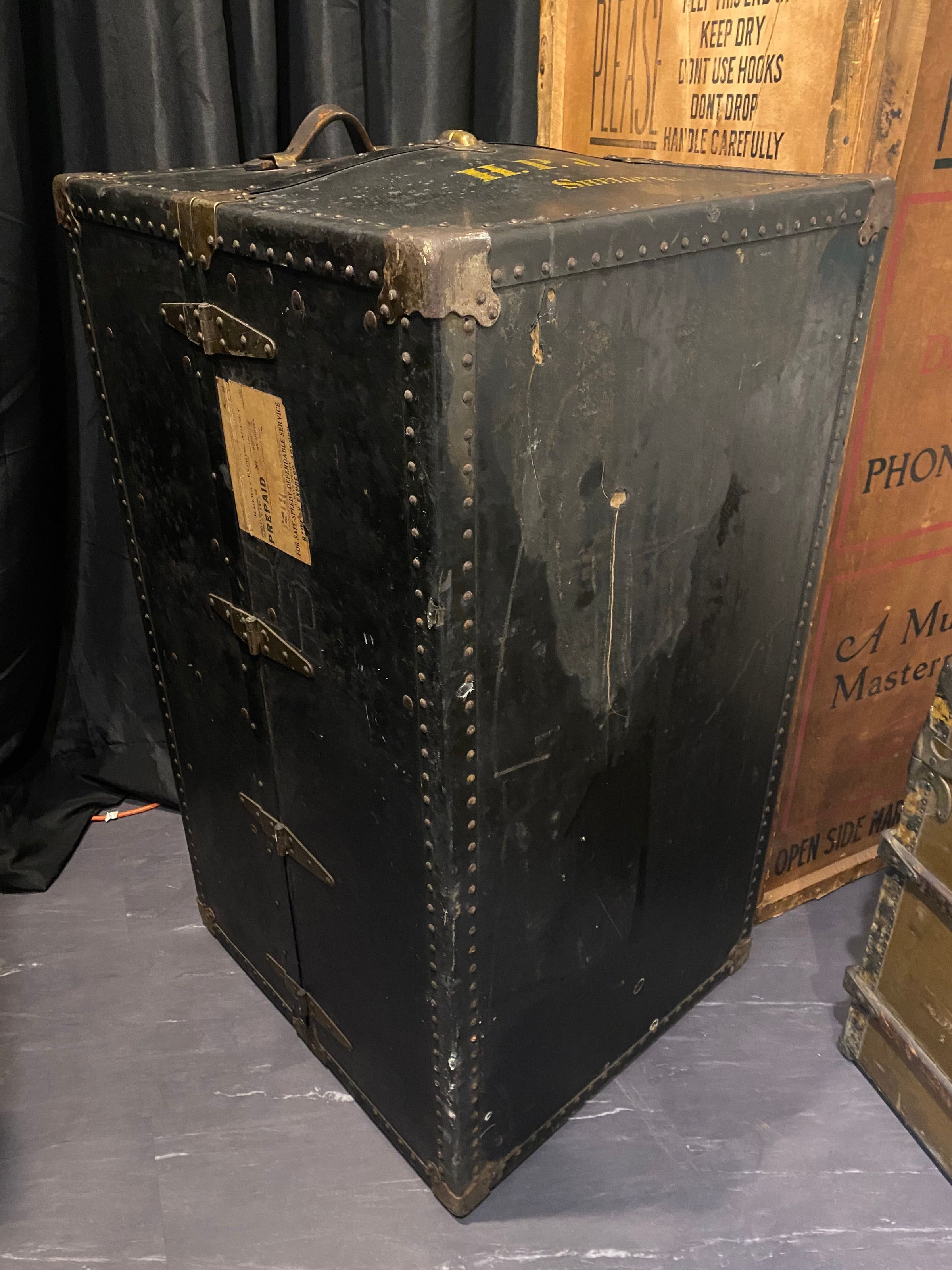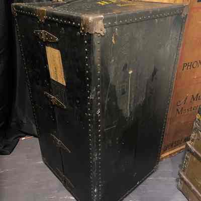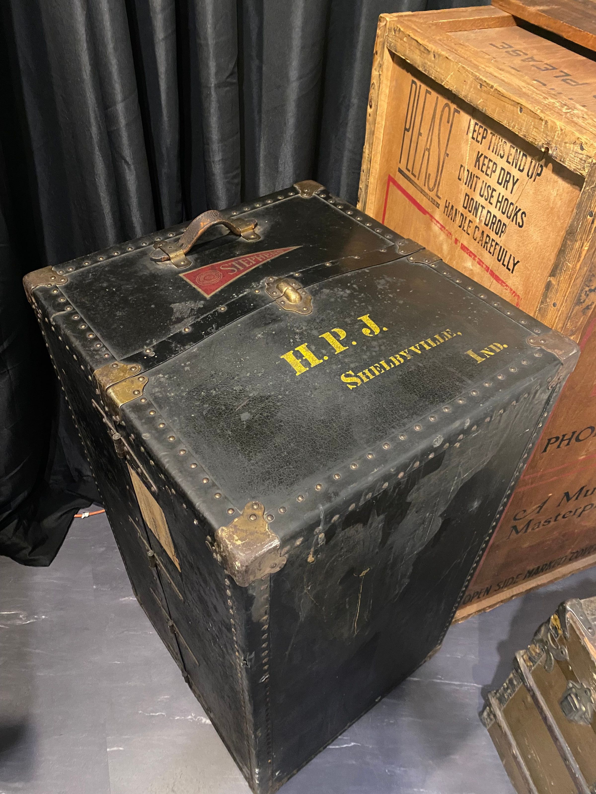 Black leather trunk with all edges trimmed in brass; another piece of metal banding in the middle of the trunk; 3 closures on front of trunk appear to be iron and brass; a leather handle on each end of trunk; metal banding is applied with rivets; protective metal knobs are at each corner and points between corners; 3 wood slats secured to the bottom; inside lined with a red and white checked fabric; also a paper maker's label inside trunk lid. Mark: Metal plaque on top reads "L E Morrison & Co./Beehive Trunk Factory/ Indianapolis, Ind" Mark: one end of trunk is stenciled "E. P."Collection