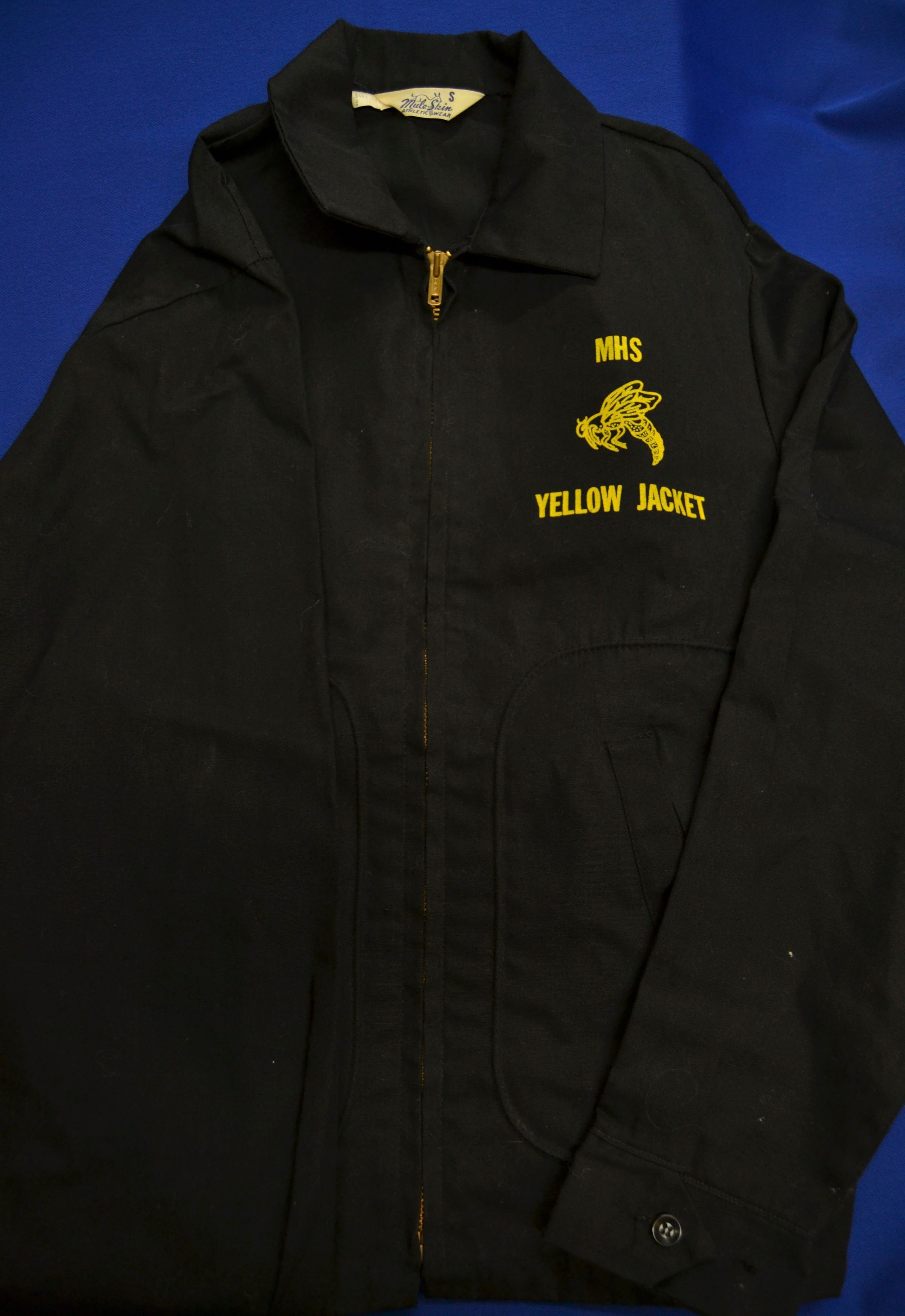 Black Morristown High School band jacket from mid-to-late 1960's. Features yellow writing on the back ("Morristown Band") and on the front left ("Morristown Yellow Jacket") with a yellow jacket symbol.Collection