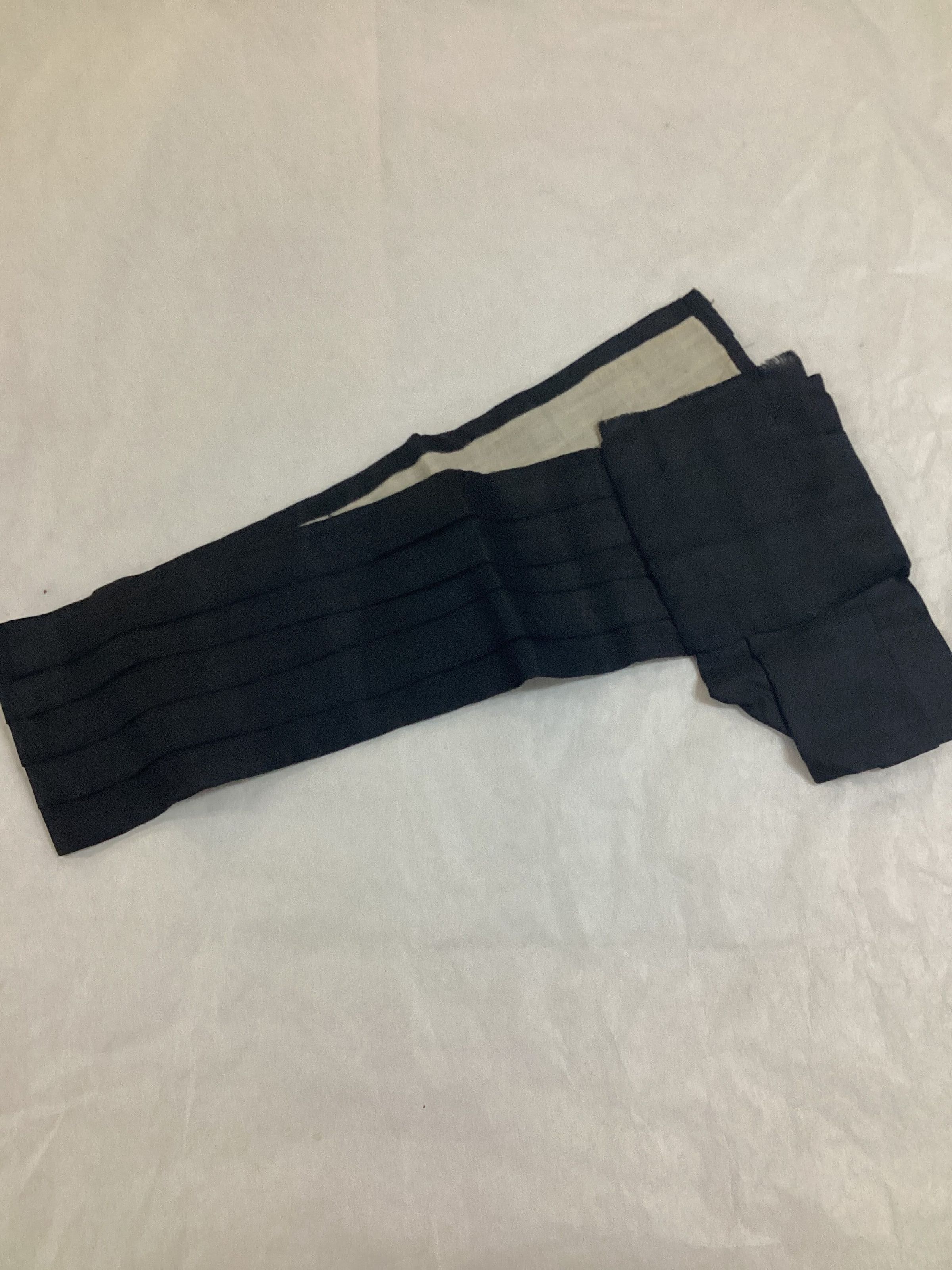 Black satin, 4 folded pleats and flat 4" square with 3" tail. Lined with buckram; closed with 3 snaps.