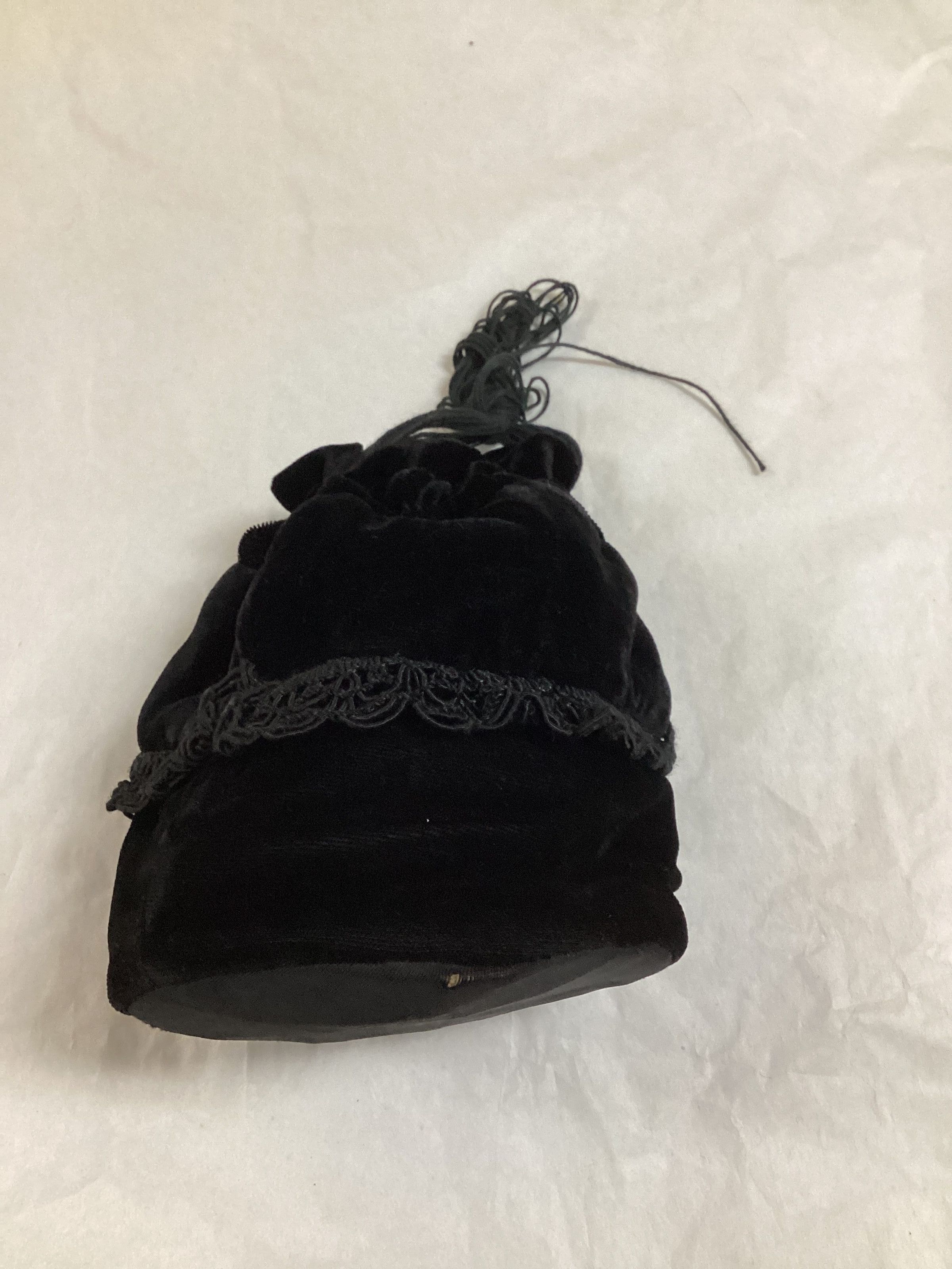 Black velvet evening purse; pouch type with drawstring; 5" round bottom corners in black silk faille; 7 1/2" velvet sides - 2 1/2" up from bottom is row of heavy black lace; 3/4" frill at top of drawstring. Lining is black silk; drawstring is embroidery floss.Collection