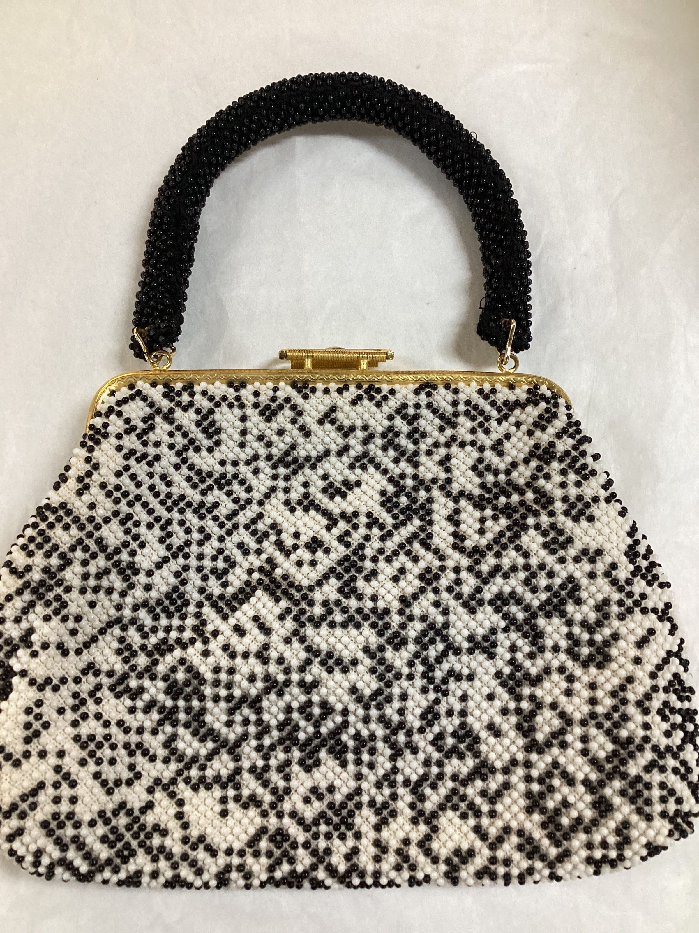A: purse, black & white beads, black beaded handle, black beads on the lining,