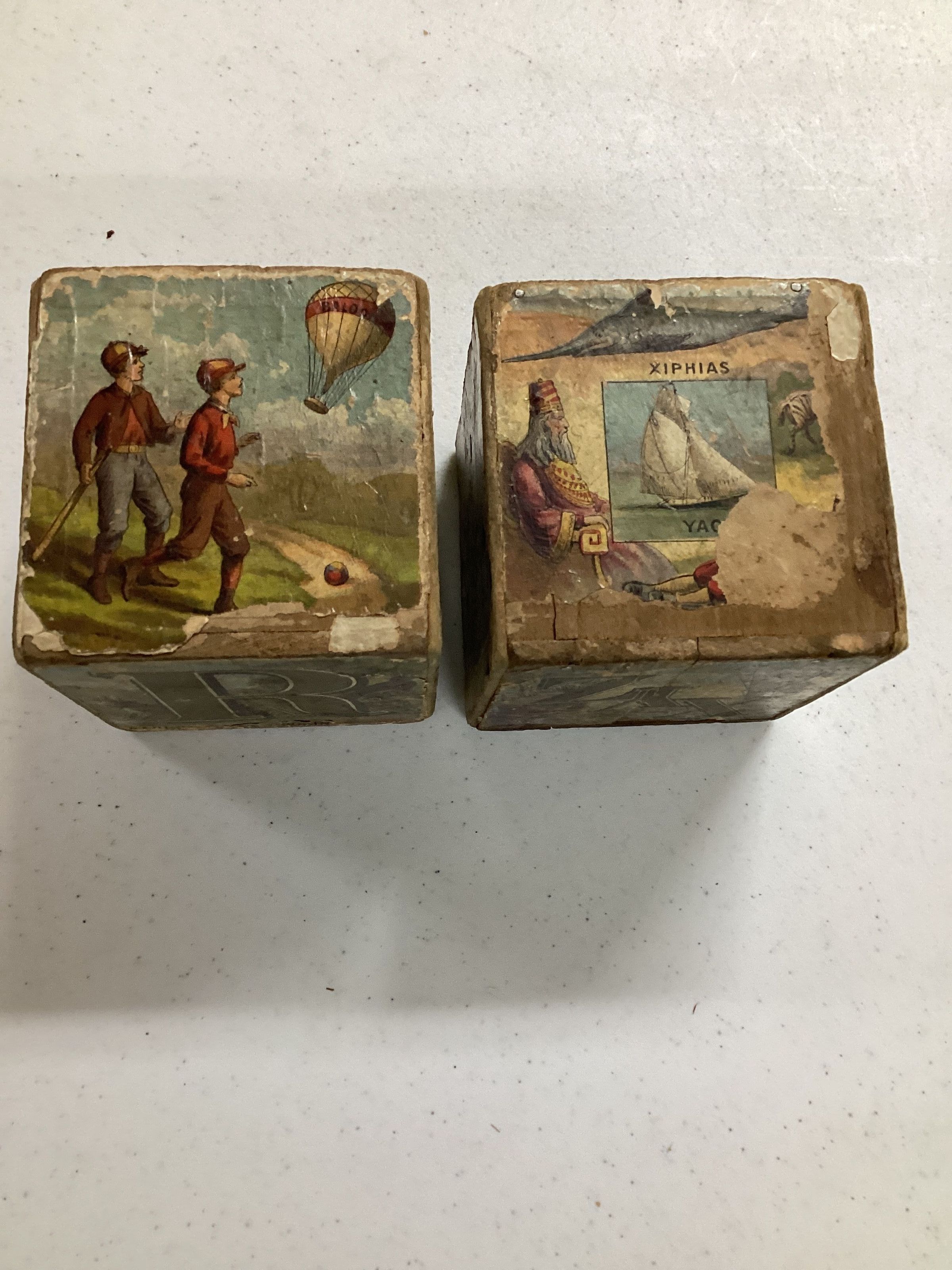 2 wooden blocks, each side has different pictures, letters R J B on one block; P-H-XYZ on one block. Both covered with paper and painted objects. Letter sides are illustrated with something depicting the letter. Blocks subnumbered 1985.001.015A and .015BCollection