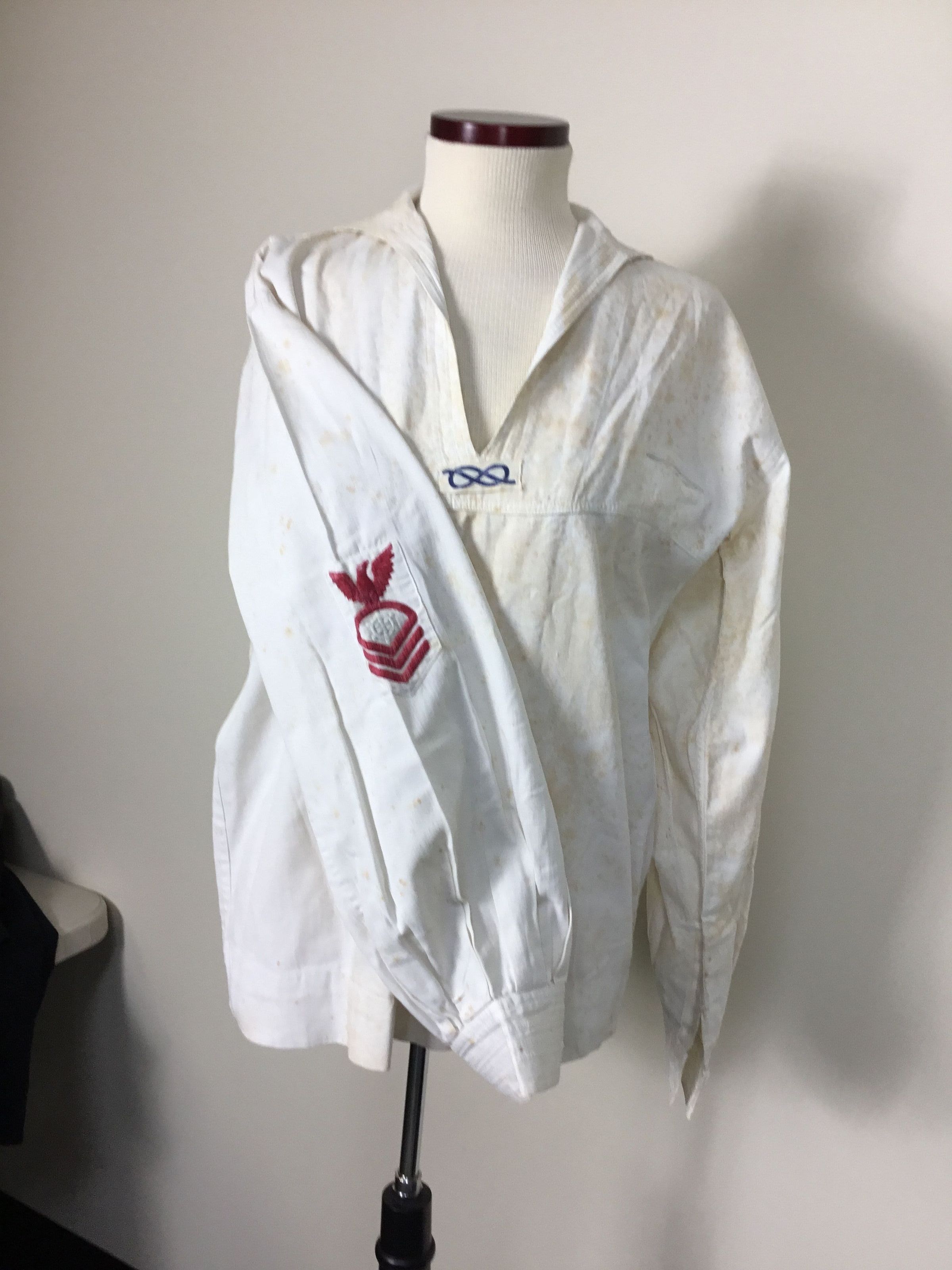 Middy blouse worn by Frances Megee Compton, born May 3, 1901. Worn when she played basketball at Boggstown High School c. 1918. White 2-button on cuffs, red eagle emblem on sleeve. Blue "square knot" at neck front.Use