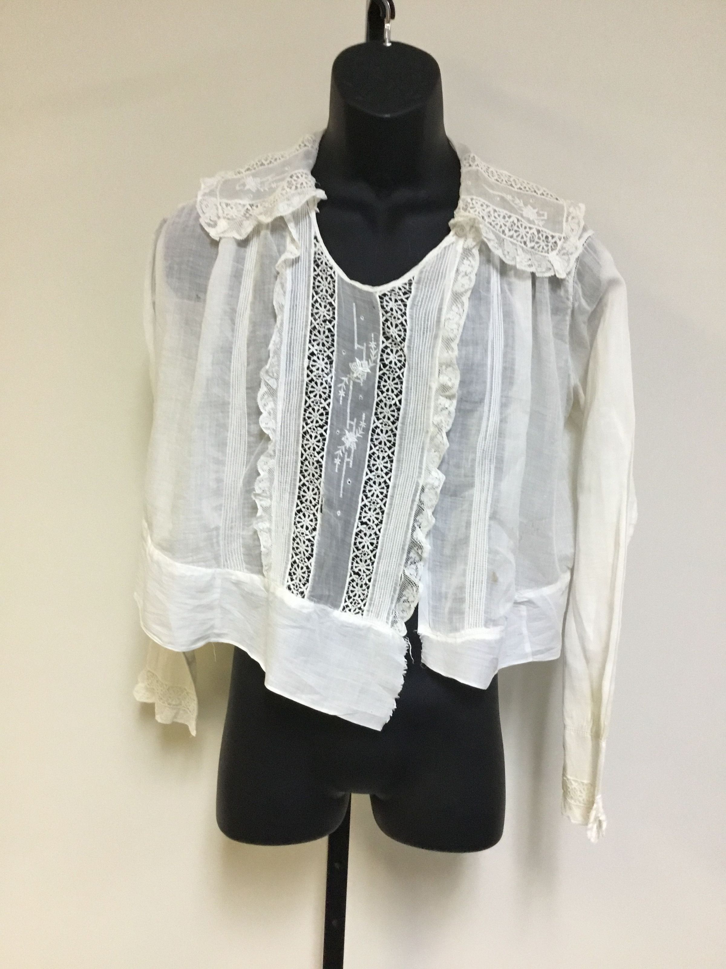 Cotton voile, ecru shirtwaist, or blouse with lacework, cut work, embroidery nd fine pleating down the front. The collar has the lace, cutwork and embroidery. The buttons on right front are hidden behind the panel.Collection