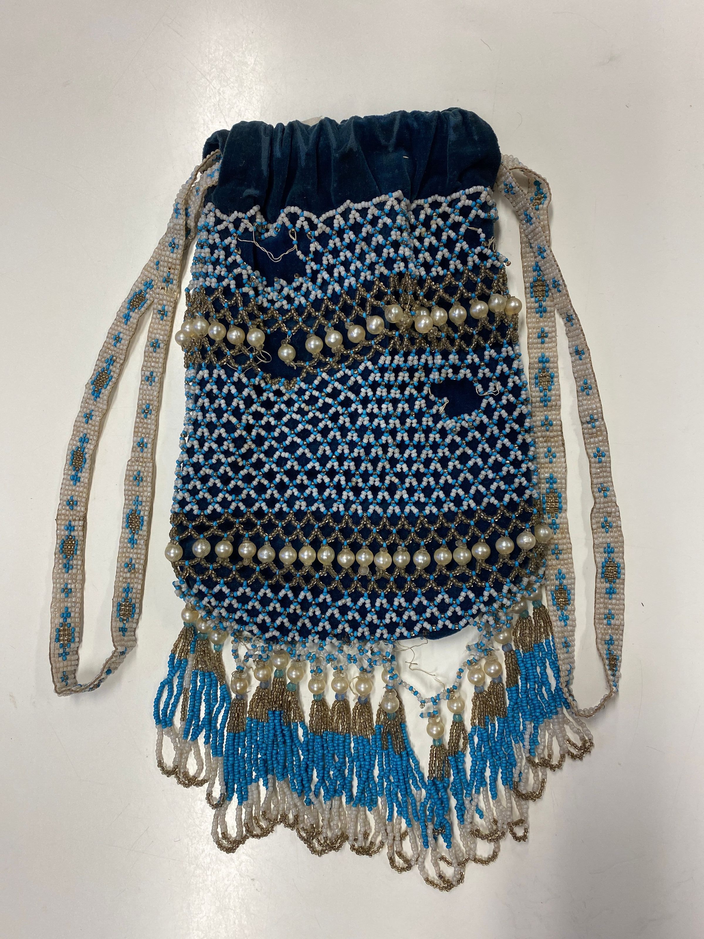 Blue velvet bag with small blue/white/clear beads and bands of pearls. Long strap. Bag is lined.Collection