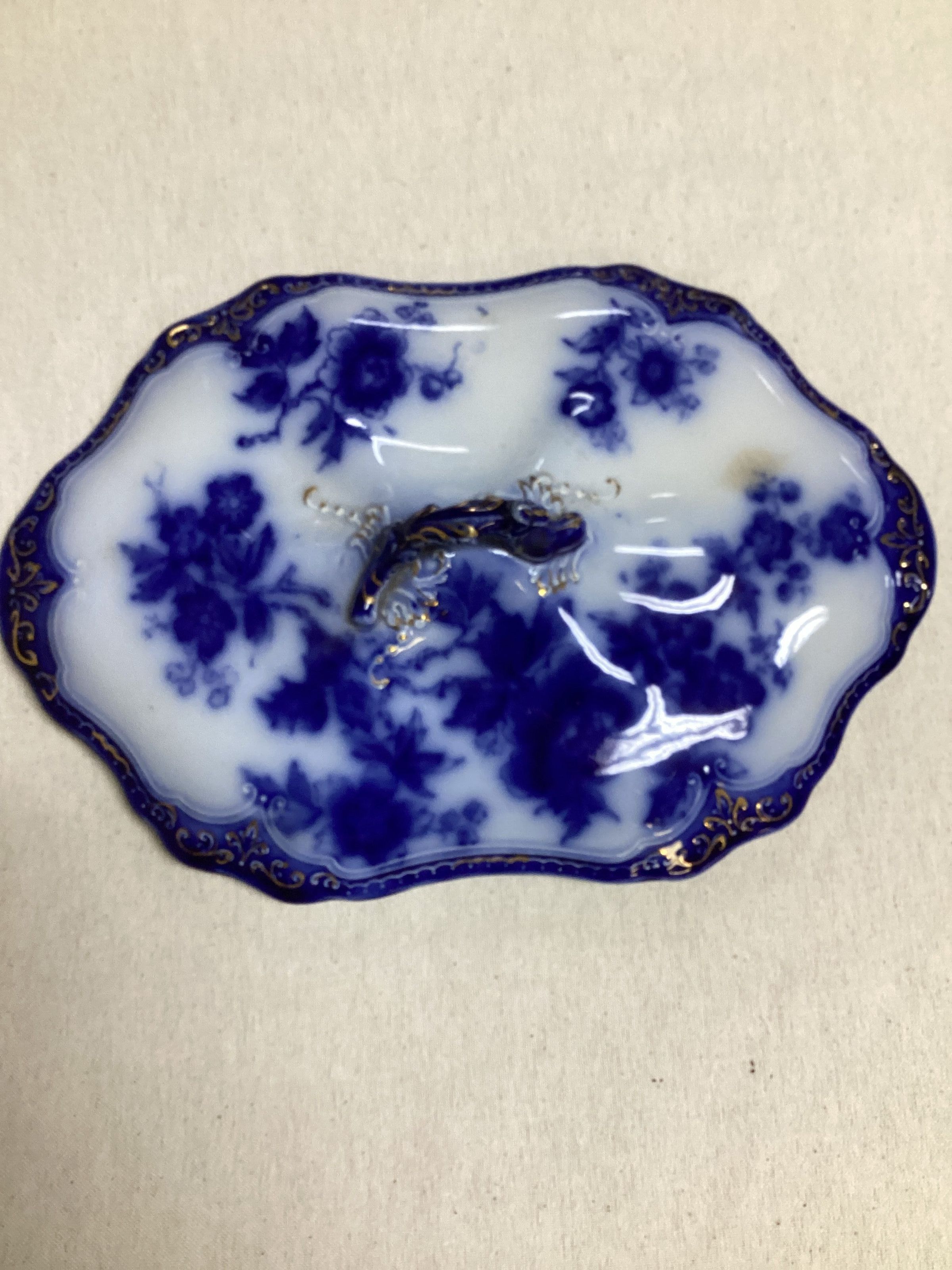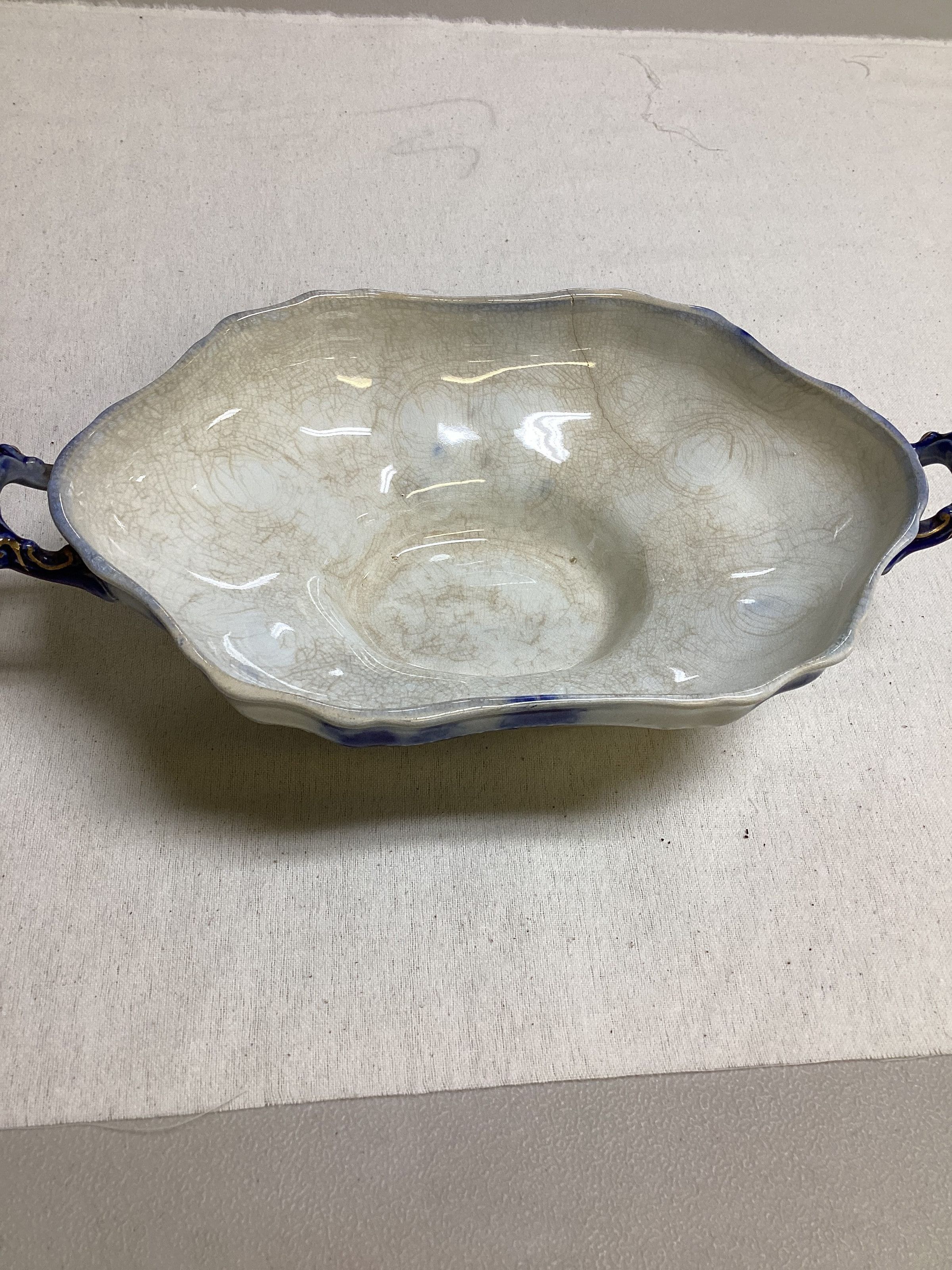 An oblong vessel with a handled lid; bowl has blue floral decoration; embossed white & gilded lines and dots surround edge approx. 1" from top; two blue & gilt handles are attached at opposite ends; foot of bowl has slightly scalloped edge above which is a raised design in white and gilt; lid also has blue decoration, the edge having same raised pattern as bowl; center of lid rises to a peak upon which is attached a "D"-shaped handle which is blue and gilt; below handle is a blue and gilt raised pattern. Stamped in blue on bottom: BYZANTINE/ROYAL/SEMI PORCELAIN; underneath is a crown, below which reads: WOOD & SON/ENGLAND; approx. 1" below and upside-down is the number "22".Collection
