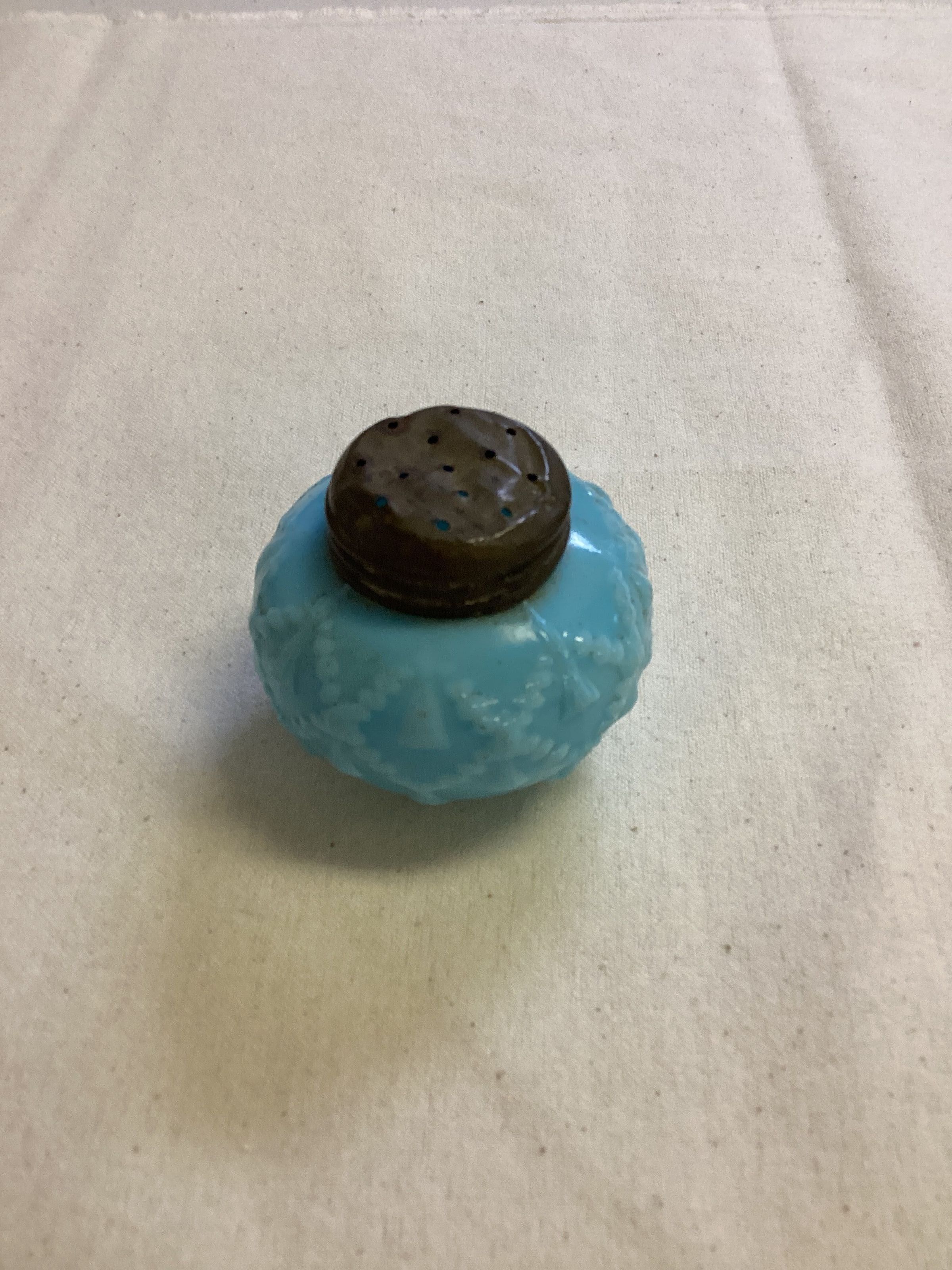 Pepper shaker, round and squat; opaque blue; tassel braid pattern; screw-on brass top; mold made in four sections.Use