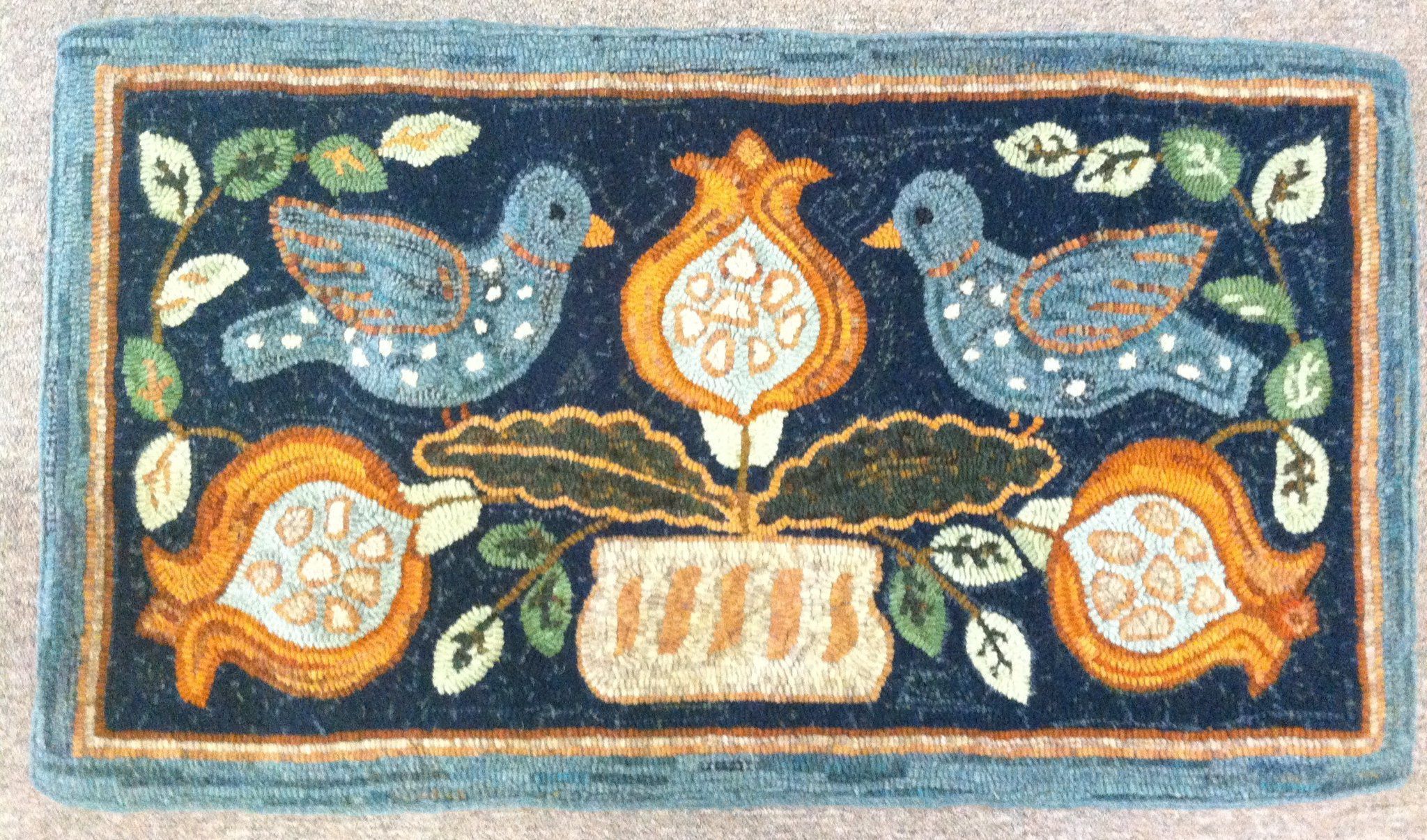 Handmade hooked rug. Pattern is "Birds and Pomegranates" by Edyth O'Neill. Wool strips are cut .25" wide. Colors are navy, light blue, orange, brown, green, blue-grey. Bound edge done in plaid wool. Image is of two blue birds and three orange pomegranates from a light-color flower pot.Textile Type