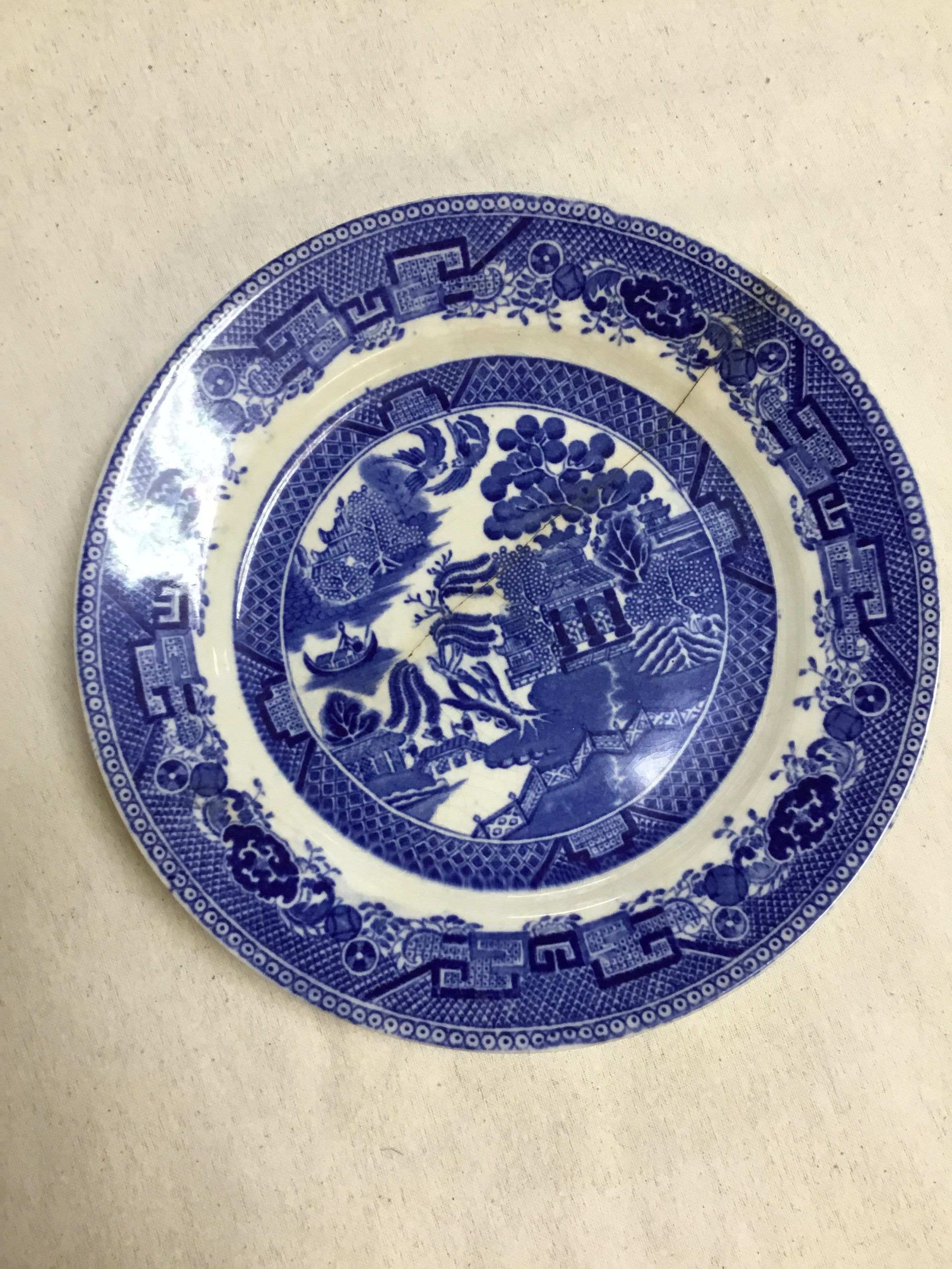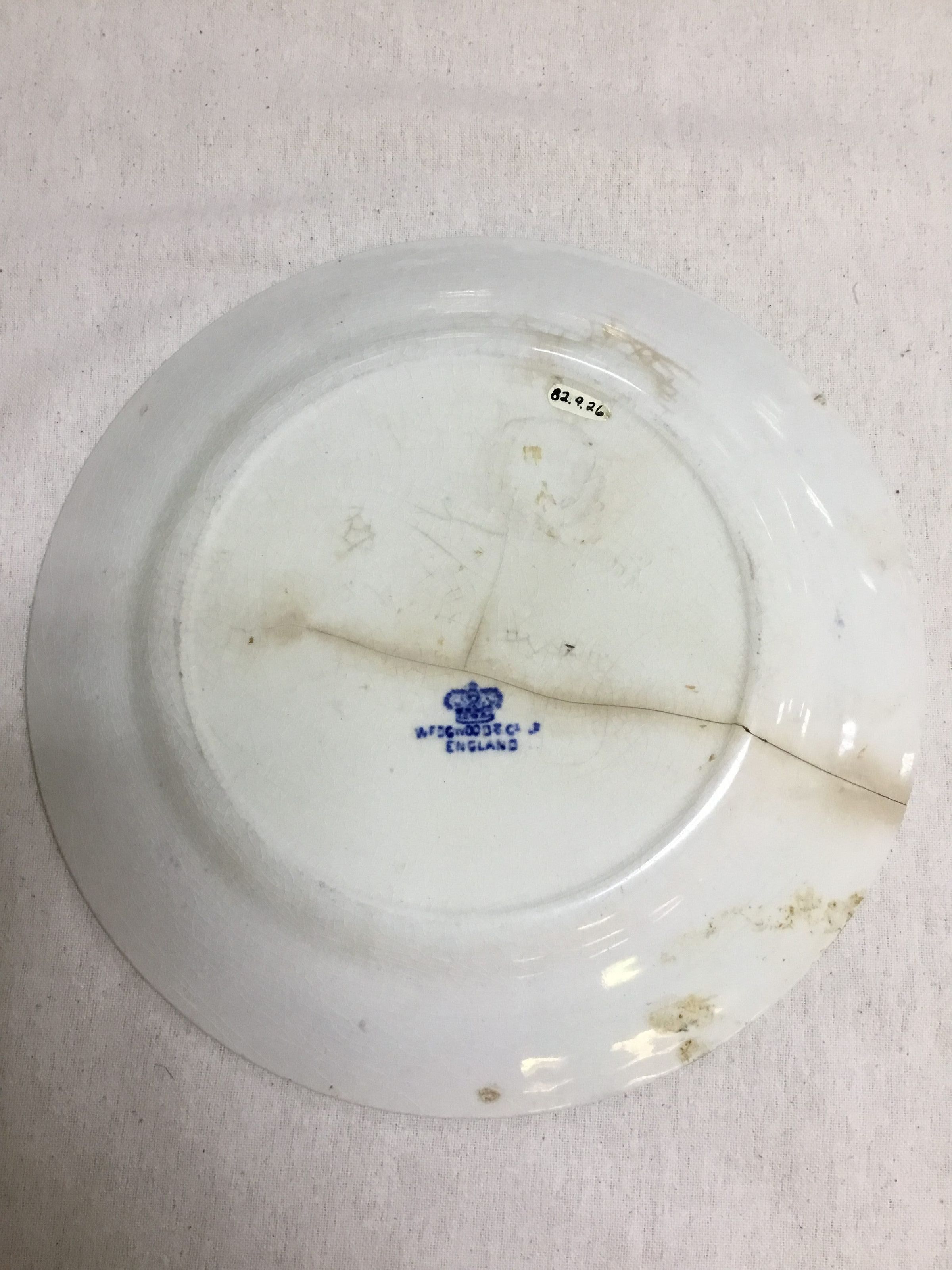 plate is blue on white with Oriental motif; first band is composed of circle and dot pattern; next band is basketweave with floral and geometric patterns on inside; a white band preceeds a band that is diamond patterned; a small white line encircles the main scene which contains a bridge, two birds, a boat and five buildings and a fence. Stamped in blue on bottom; a crown under which are the words 'WEDGWOOD & CO. ENGLAND' impressed to the right of trademark are what appears to be numbers 5, 12, and 23Collection