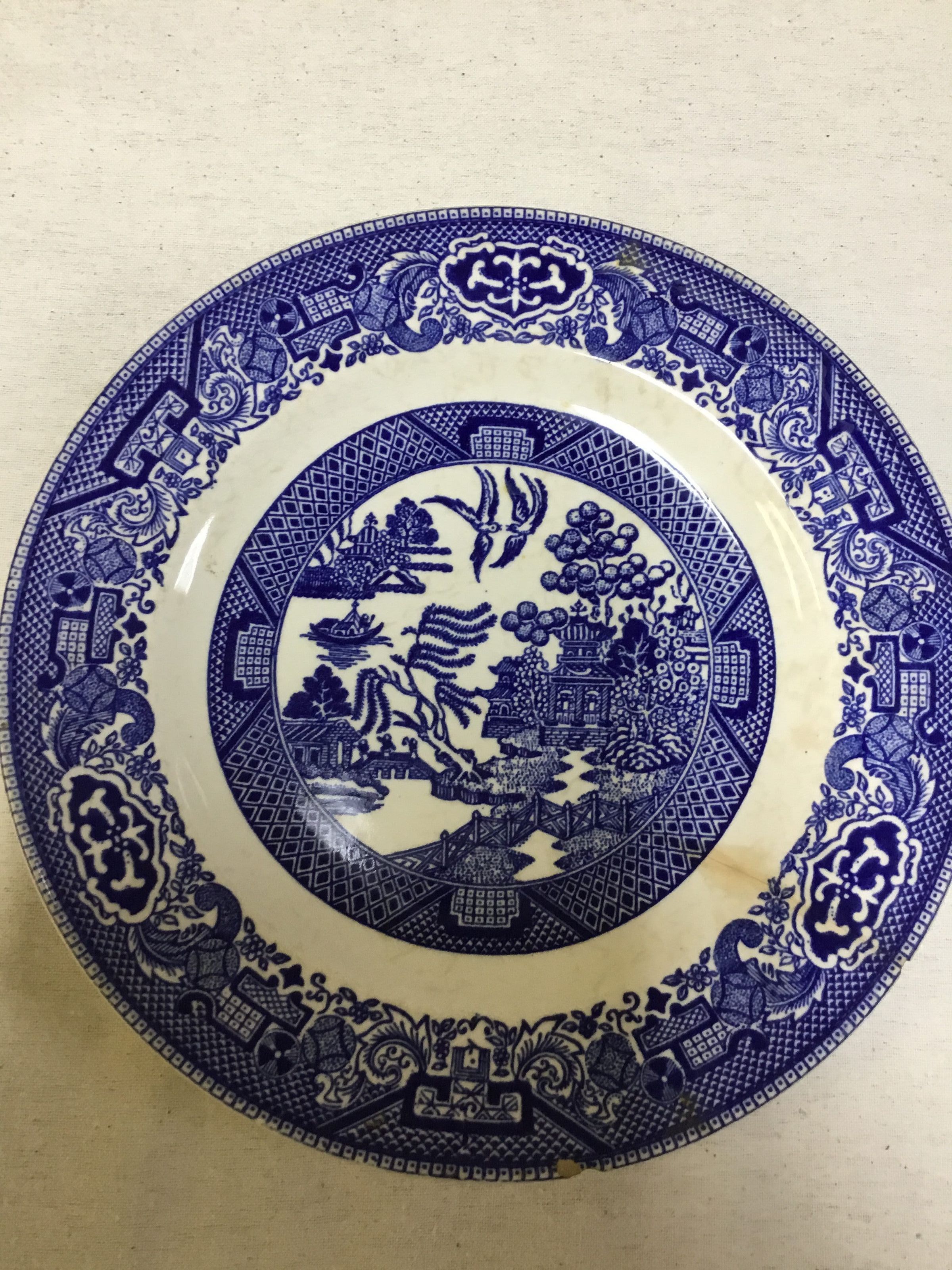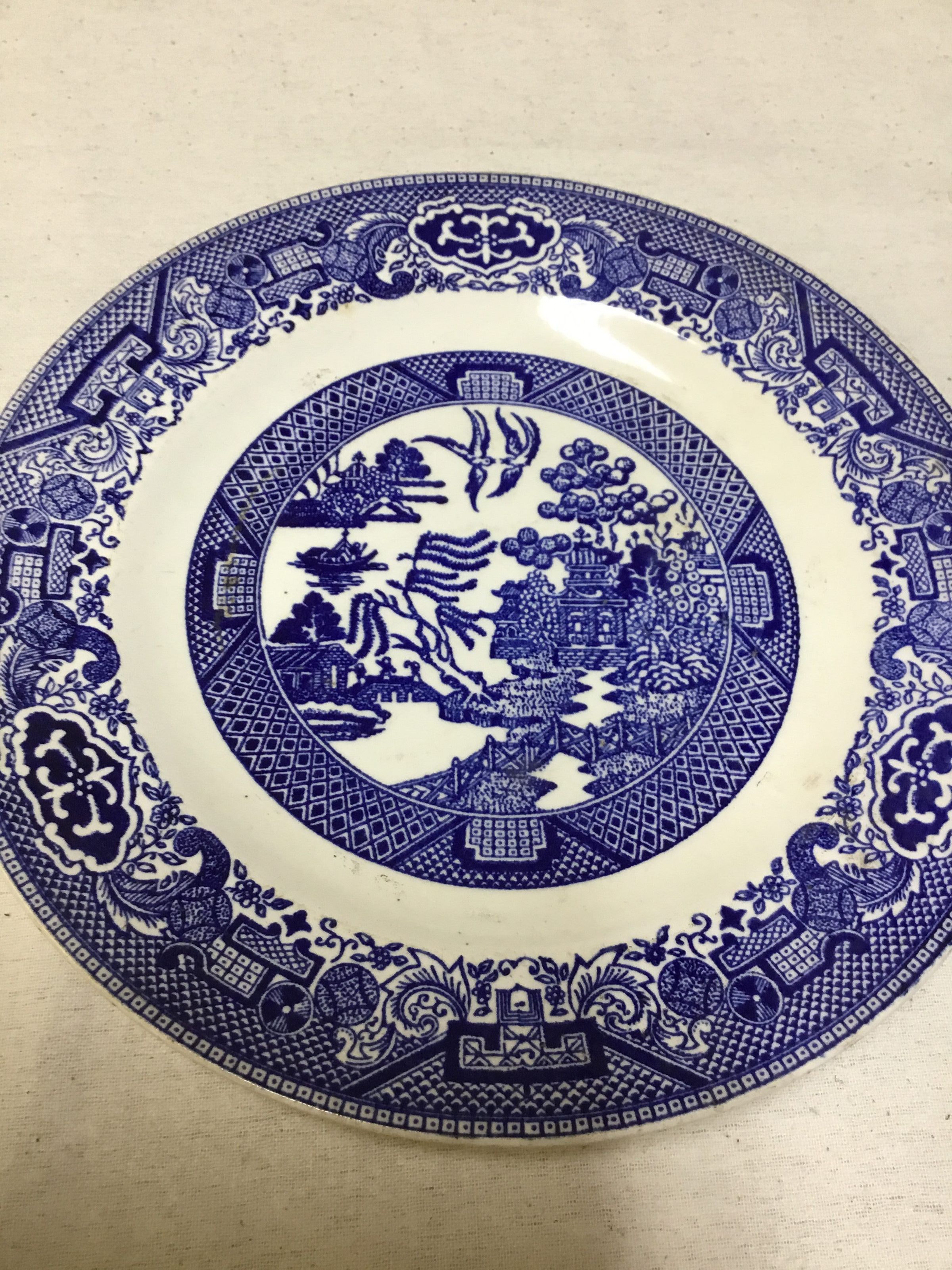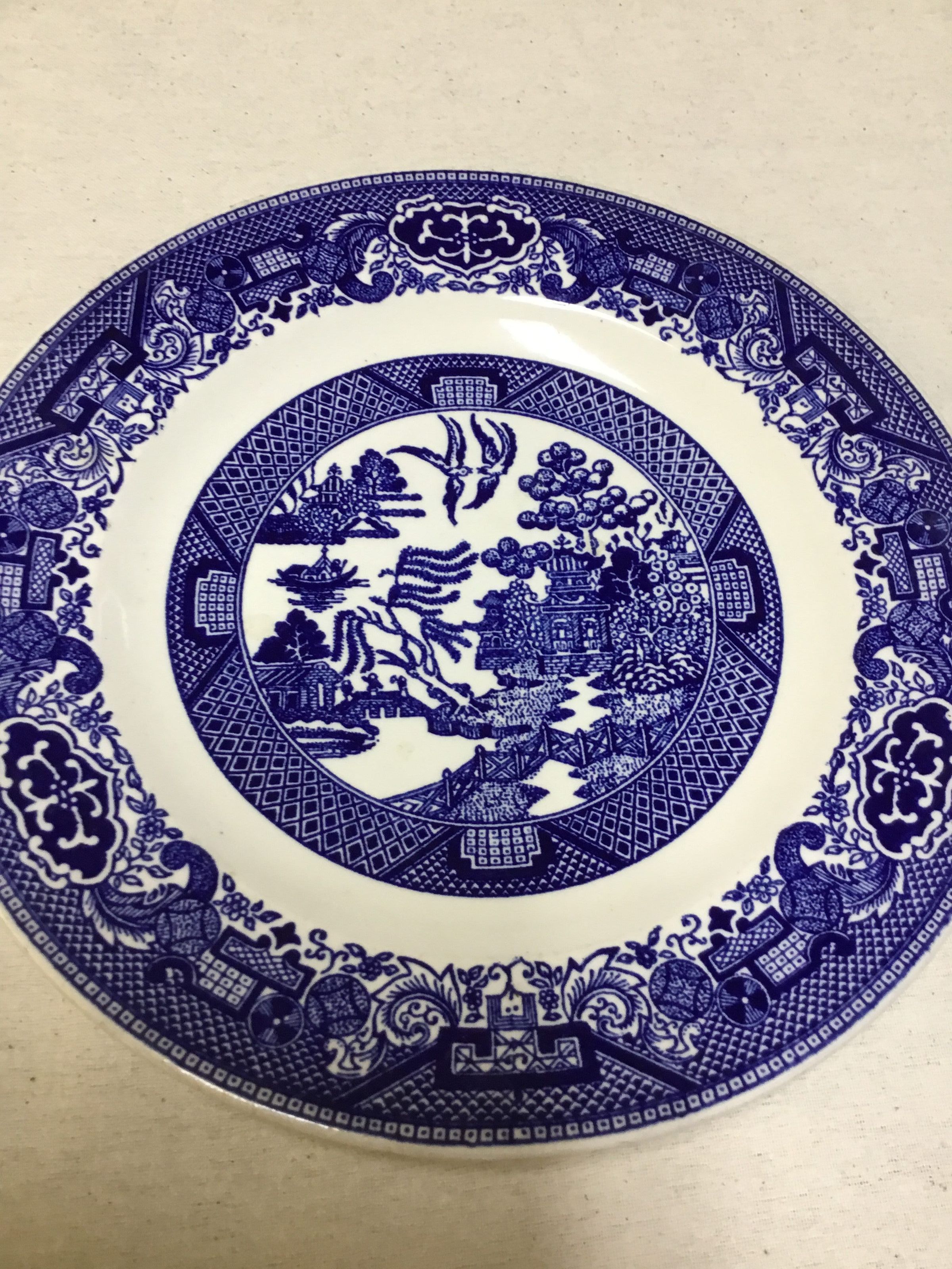 9" plates - Willow pattern - dark blue and white transfer design-scenes of temple boats and doves.