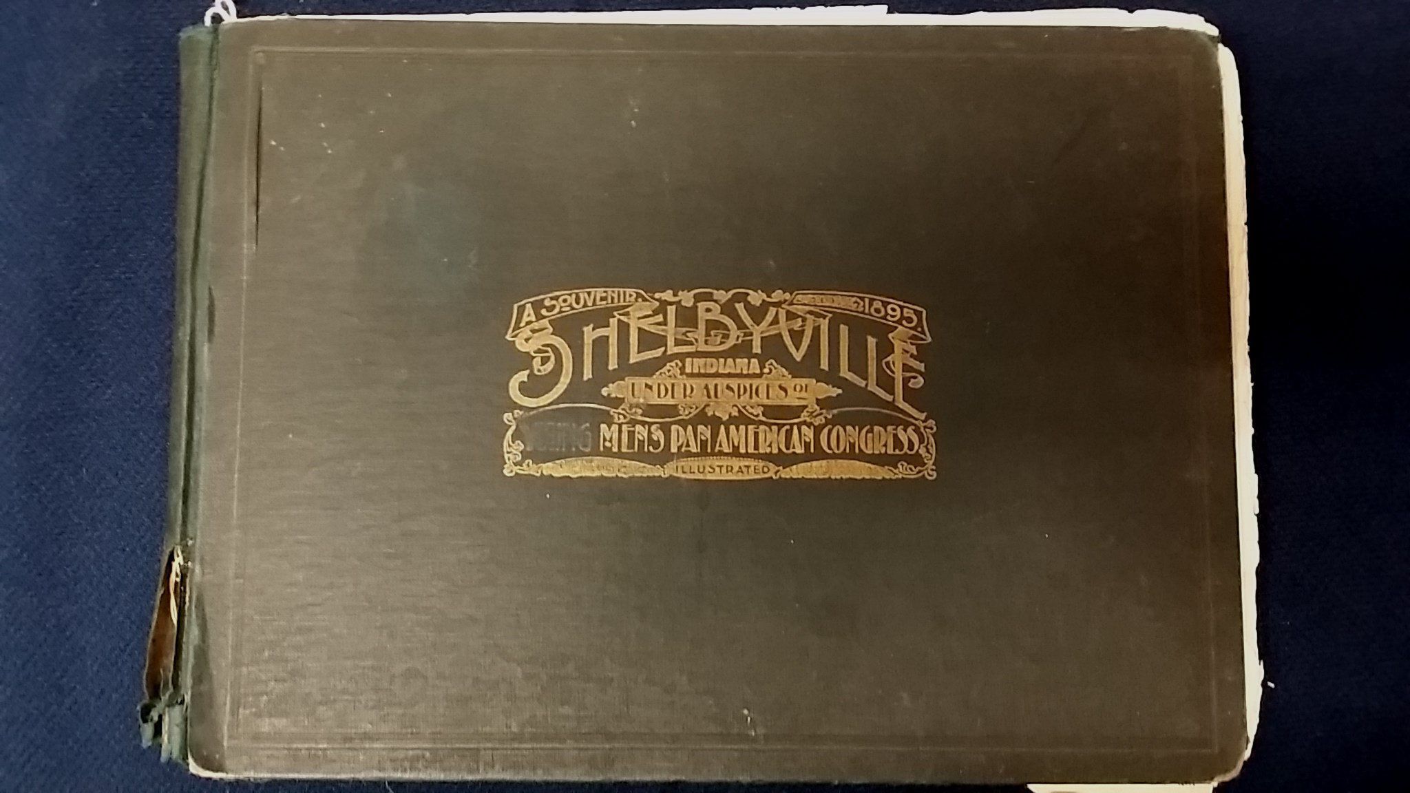 "The City of Shelbyville, Illustrated" Book is bound in black leather with gold print on the front cover. The book's spine appears to be broken and pages are loose. From the Young Men's Pan American Congress.Collection