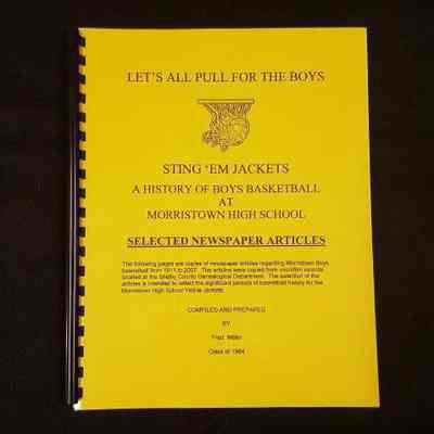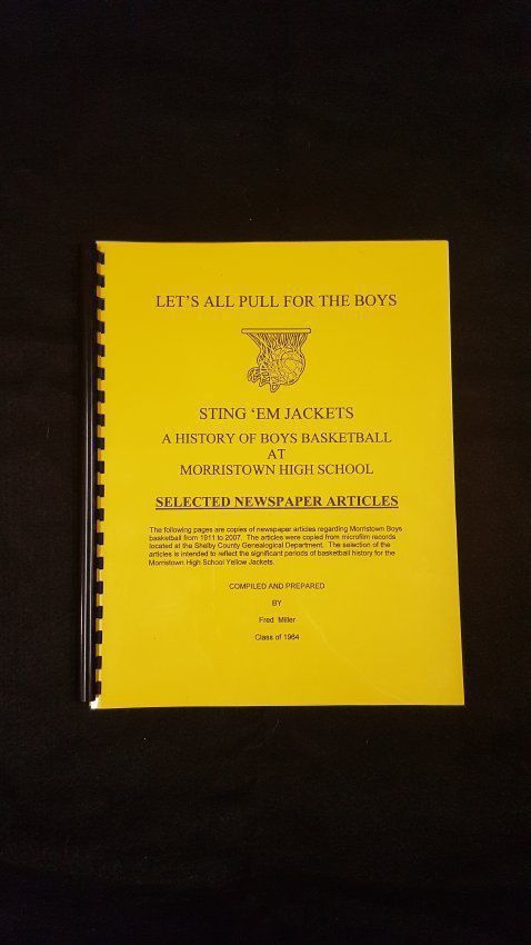 Book compiled by Fred Miller (Class of 1964) include news articles talking about the history of Morristown boys basketball from 1911-2009. IThere is a clear plastic, protective film over the front cover. The front cover says, "LET'S ALL PULL FOR THE BOYS" next line, "STING 'EM YELLOW JACKETS," next line, "A HISTORY OF BOYS BASKETBALL AT MORRISTOWN HIGH SCHOOL," next line, "SELECTED NEWSPAPER ARTICLES," next line, "The following pages are copies of newspaper articles regarding Morristown Boys basketball from 1911 to 2007. The articles were copied from microfilm records locatred at the Shelby County Genealogical Department. The selection of the articles is intended to reflect the significant periods of basketball history for the Morristown High School Yellow Jackets," next line, "COMPILED AND PREPARED BY Fred Miller Class of 1964."