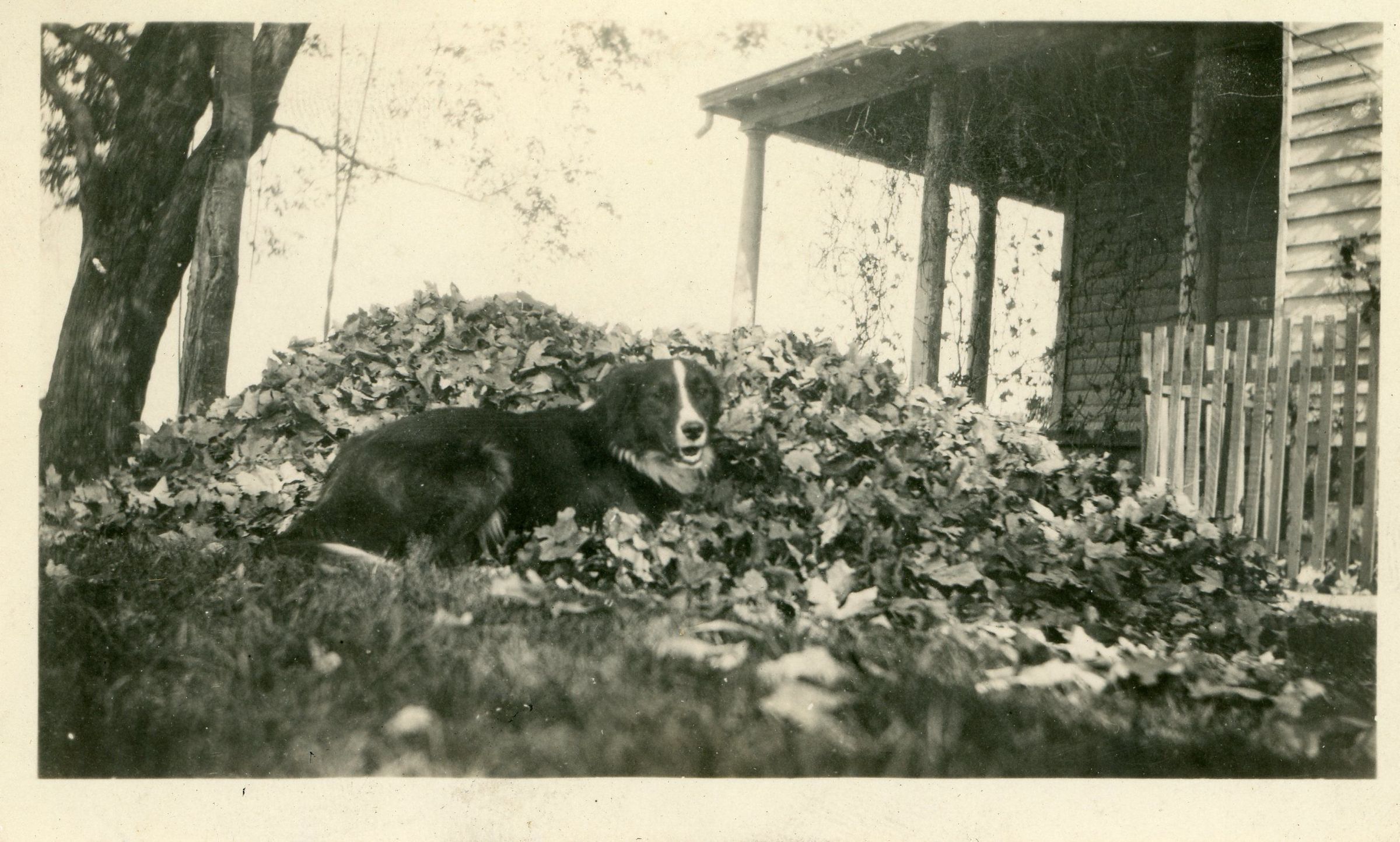 A black-and-white snapshot of a border collie lying in a pile of leaves on a grass lawn next to the exterior of a house.Photograph Details