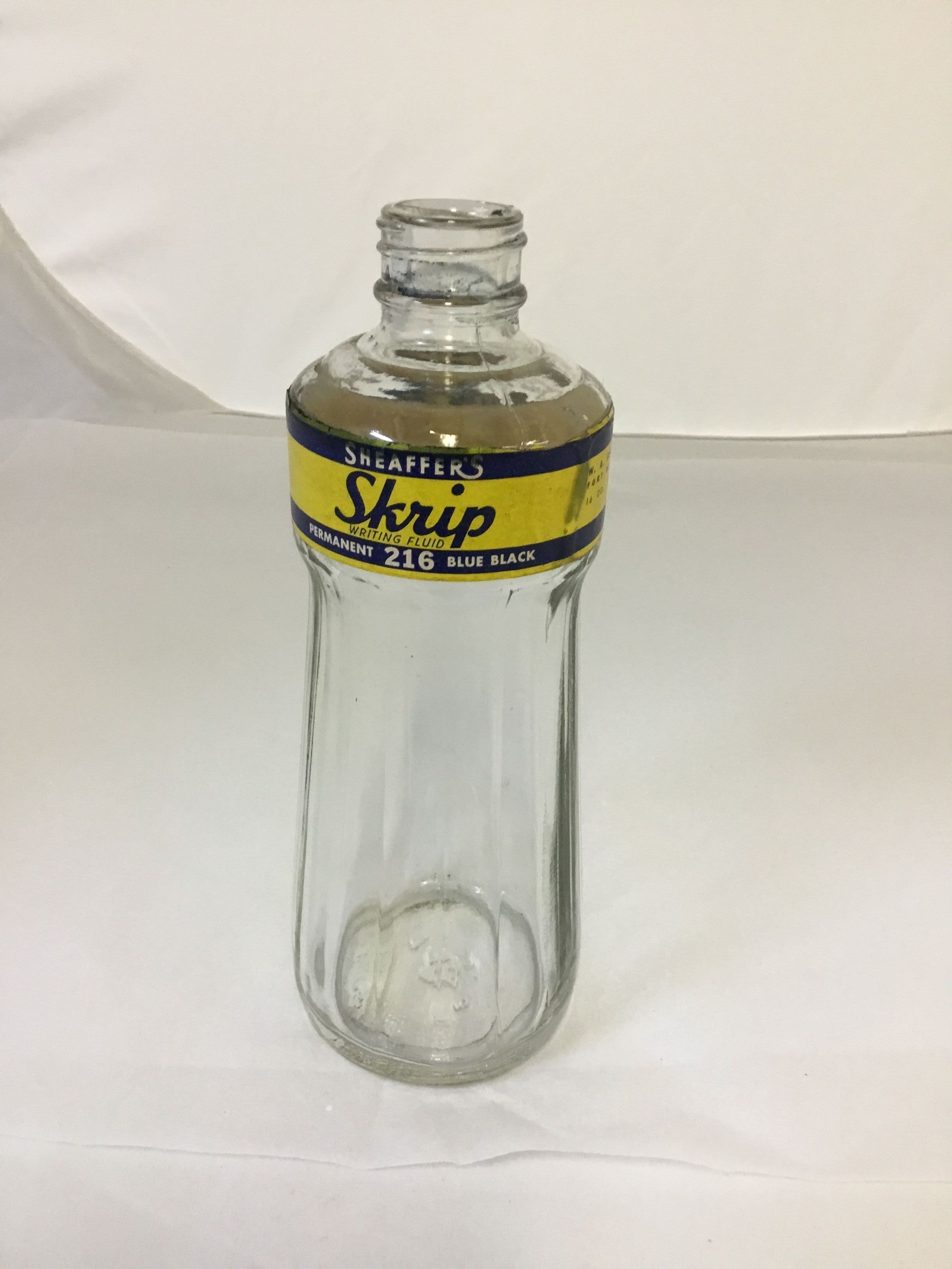 2 sections; bottle ribbed from 5 1/2", label on flat surface, then collar of bottle with circular patterns to neck; screw on black hard lid with a spout for pouring; small ridged cap covers spout; curved metal tube from spout into bottle; bottle 1/2 full of blue ink. Label printed "Sheaffer's Skrip Writnig Fluid, Permanent 216 Blue Black" Other side "W. A. Sheaffer {em Company Fort Madison, Iowa, U.S.A. 16 oz. 473 C. C. Made in U.S.A. "12 colors ,4 4 Permanent, 8 Washable.Collection