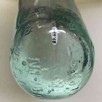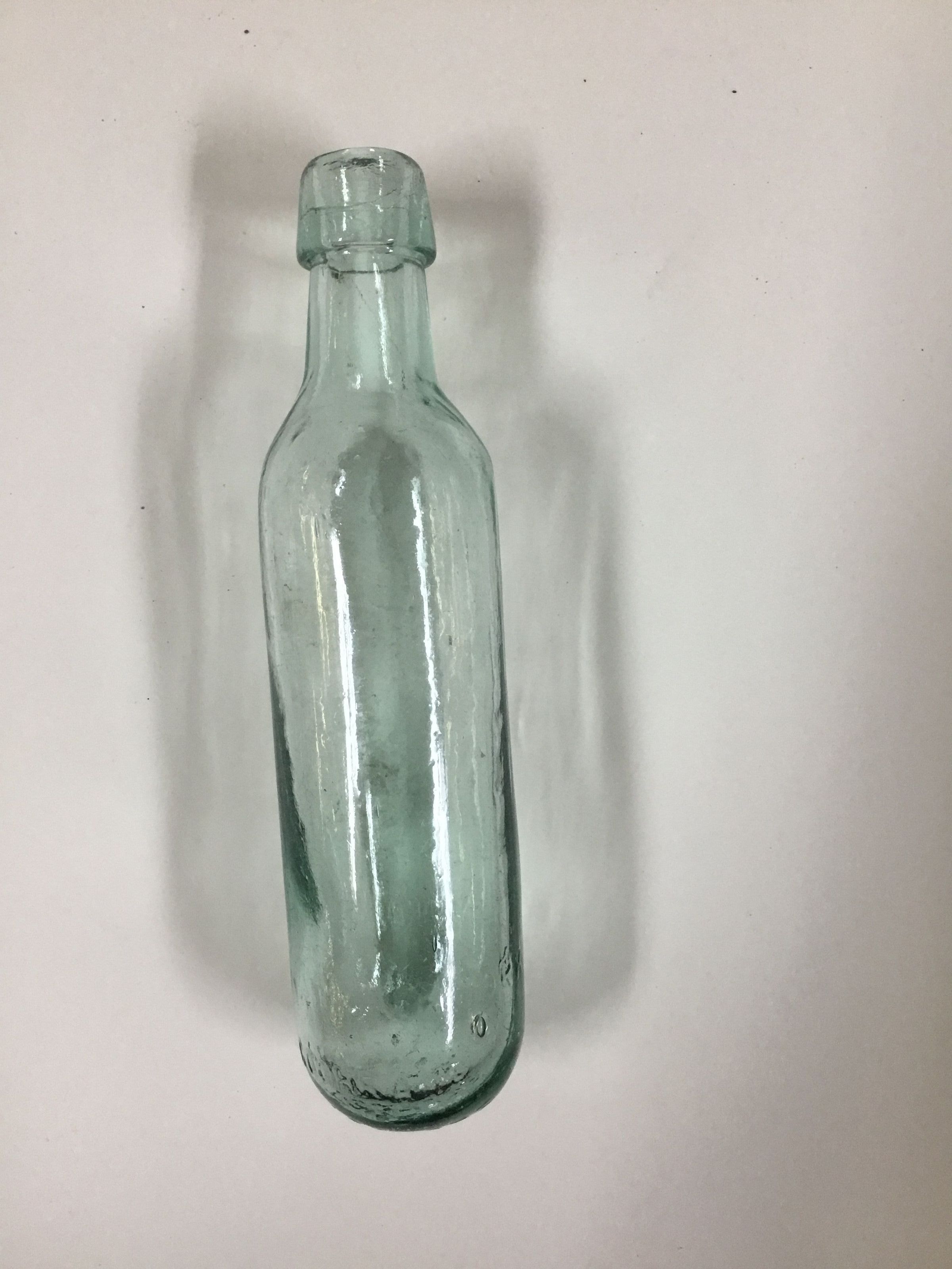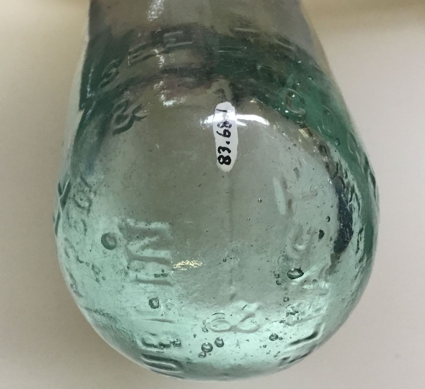 Clear glass bottle with a green tint; mold lines visible; bottle has a rounded bottom so that it will not stand up; uniform diameter from the bottom for 6-1/2" then tapers in to form a neck that is 2" long, about 3/4" of neck is largert than rest to accomodate a cork stopper; near bottom of bottle is embossing: "SEE THAT EACH CORK IS BRANDED" bubbles and imperfections are visible in the glass.Collection