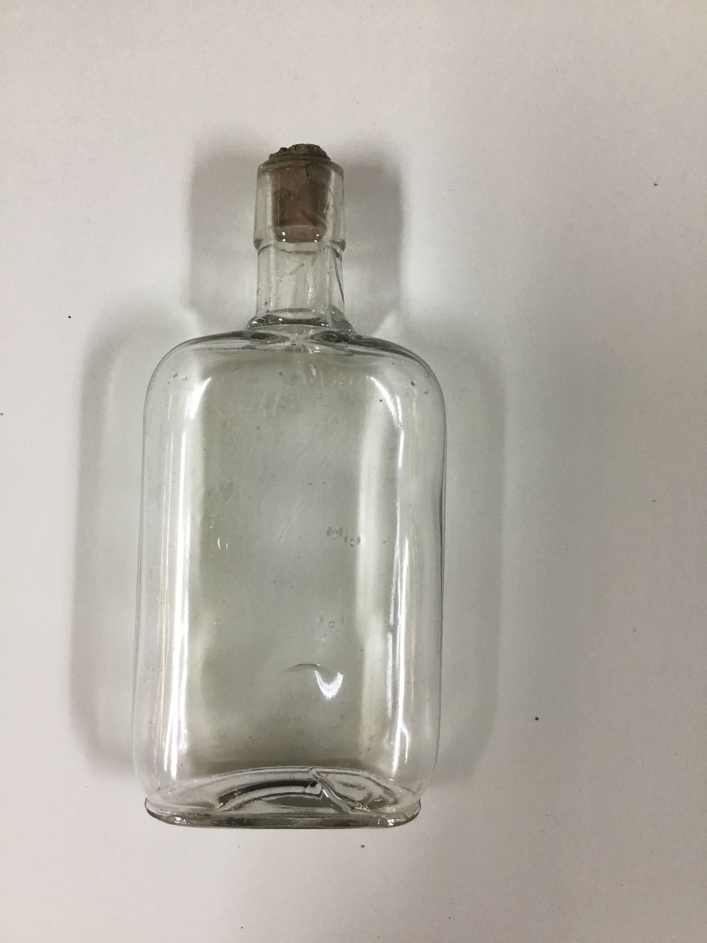 Clear glass bottle; mold made as seam lines visible on sides; flat bottom and shoghtly rounded shoulders; shoulders are 4 1/2" from bottom; has 1 3/4" neck; has a cork stopper; glass has trapped air bubbles and 2 deformities on one sideCollection