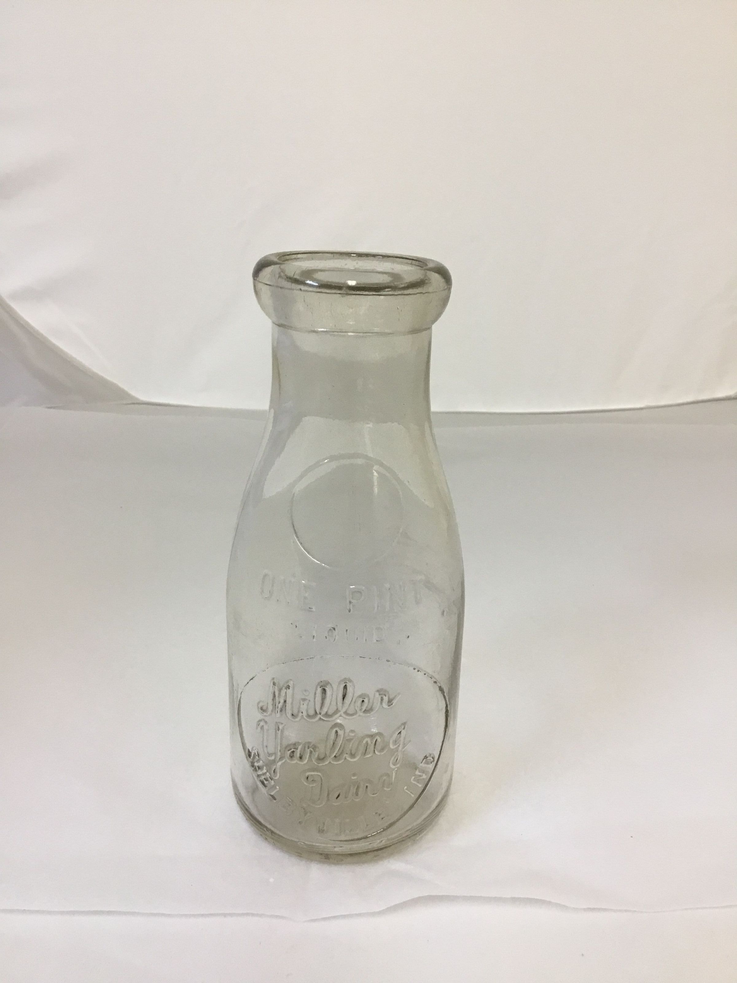 Milk bottle of clear glass; mold marks visible on sides; has flat base and is cylindrical for 4" above the base then tapers to form the neck; top of bottle has 2-1/4" diameter with a ring style lip; front of bottle has blank circle embossed on neck and below that is embossed "ONE PINT/LIQUID"; below this is an oval shaped embossing with "Miller/Yarling/Dairy/Shelbyville/Ind"