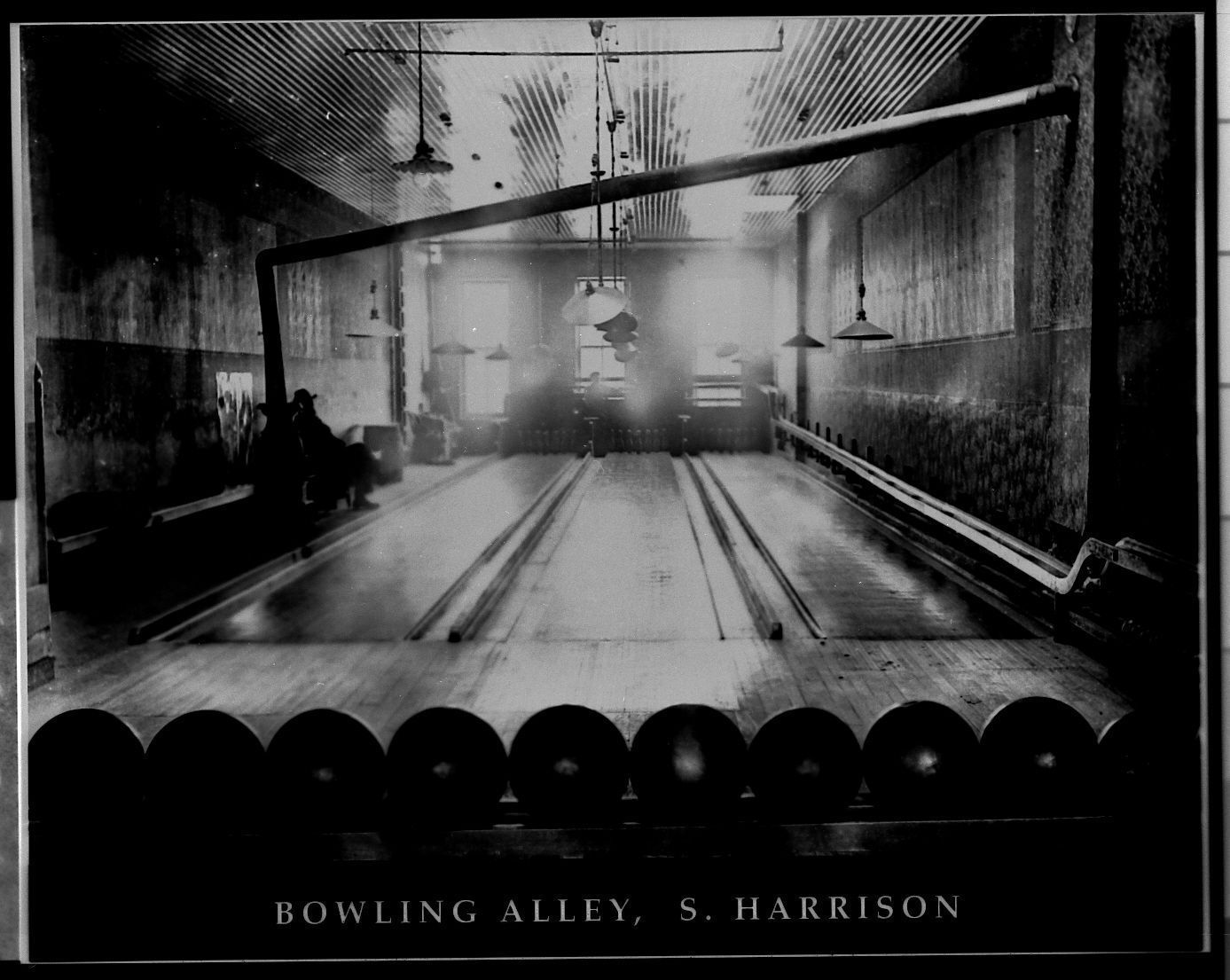 Donation, 07/26/2005. Black and white film negative in landscape format. At bottom edge of negative: "Bowling Alley, S. Harrison." [see 8x10 photo #2005.