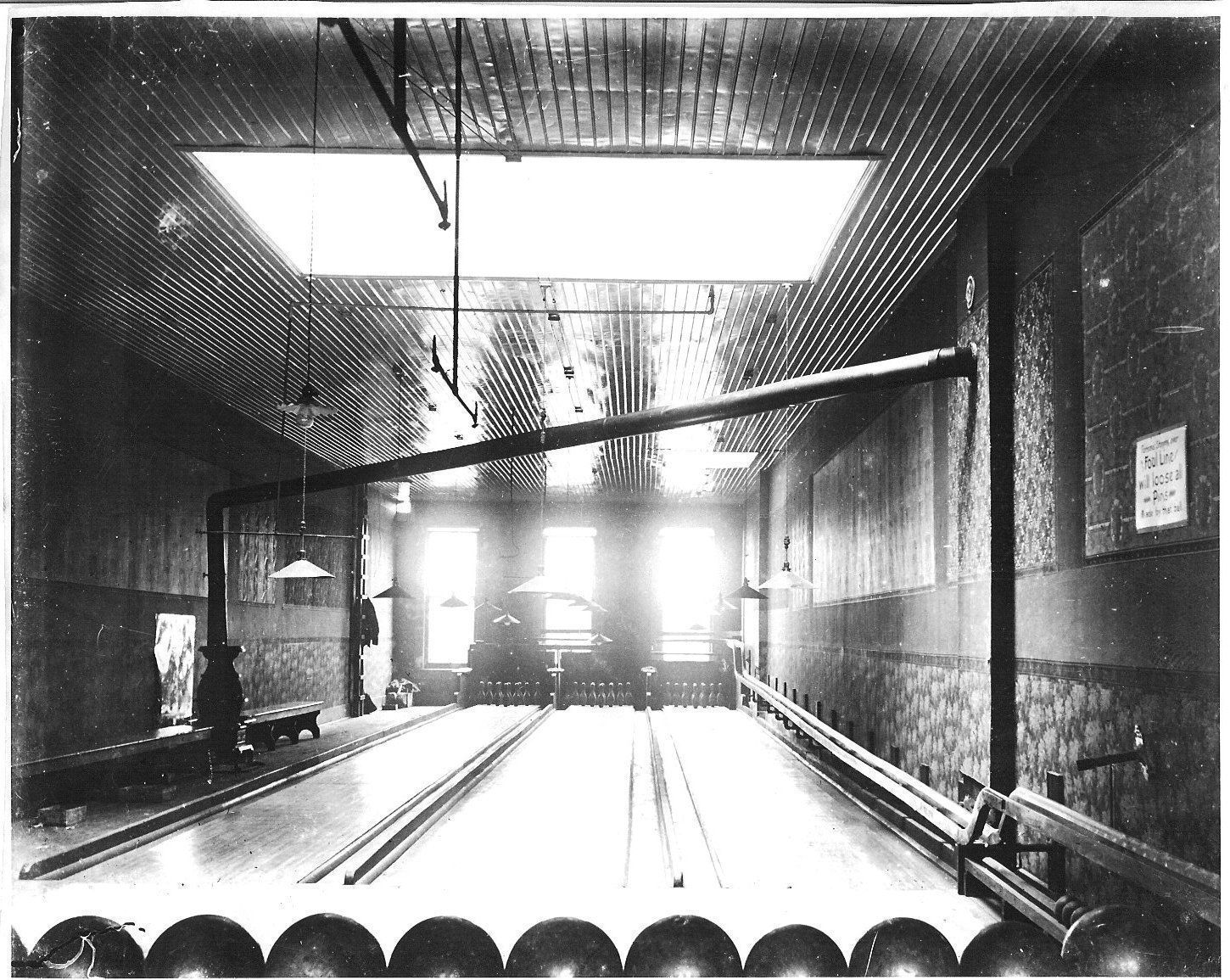 Donation, 07/26/2005. Black and white glossy photographic print in landscape format. Image is of the interior of a large room. Three bowling lanes with set up pins at far end, balls in foreground. Wood-burning stove on left of room, long chimney to right wall. On back: "Early bowling alley/Location?"Collection