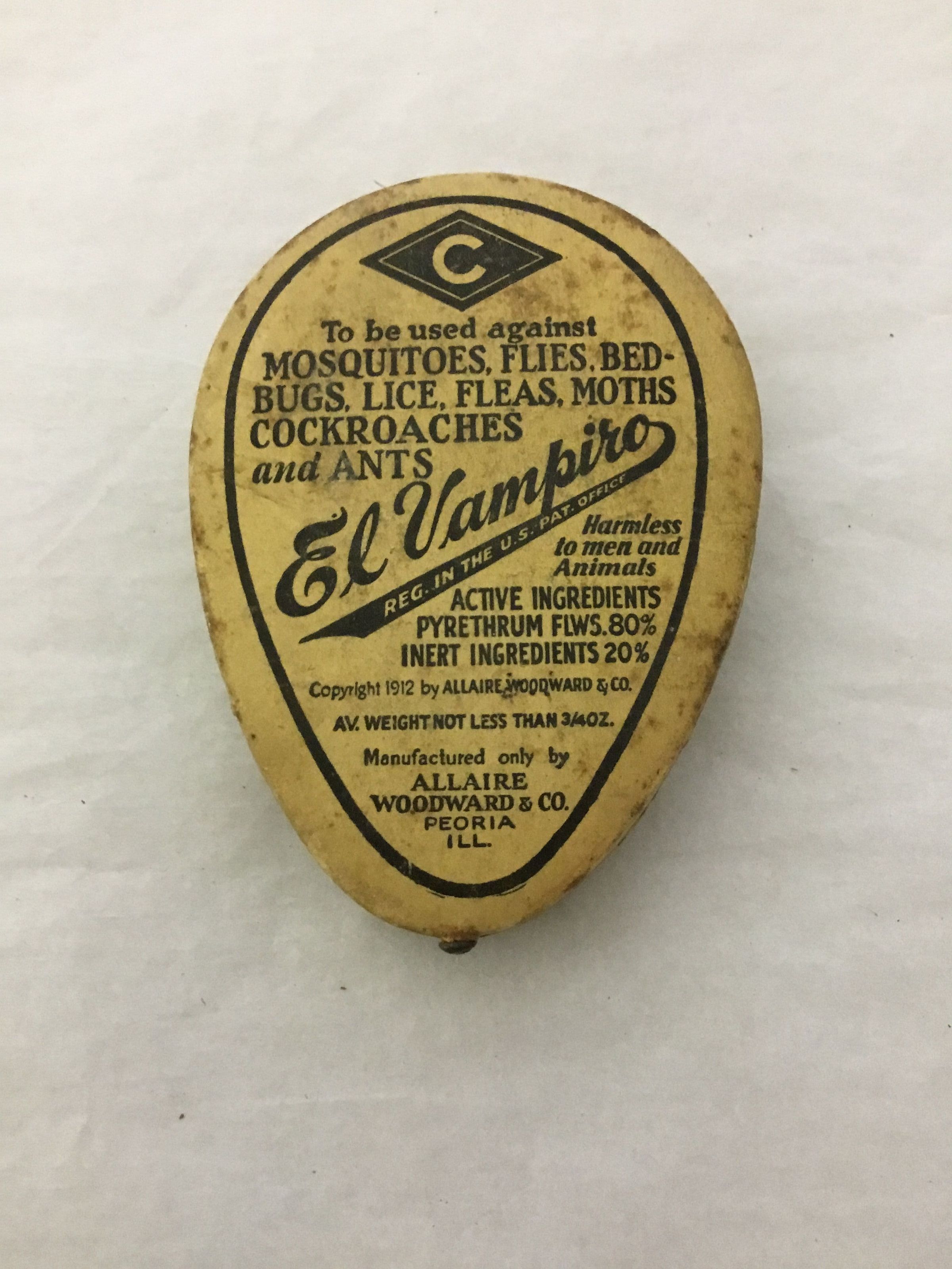 An oval cardboard box-yellow in color with black letters and company symbol and list of ingredients. Has a nail in small end that pulls out when in use. Instructions for use on the back side. "EL VAMPIRIO- Copyright 1912 Desing Patent July 15th 1919 1-34" printed on front of box as is "Allaire Woodward & Co. Peroia, Ill". Used for killing insects, such as flies, bedbugs, lice, fleas etc. Used like a small bellows.Collection
