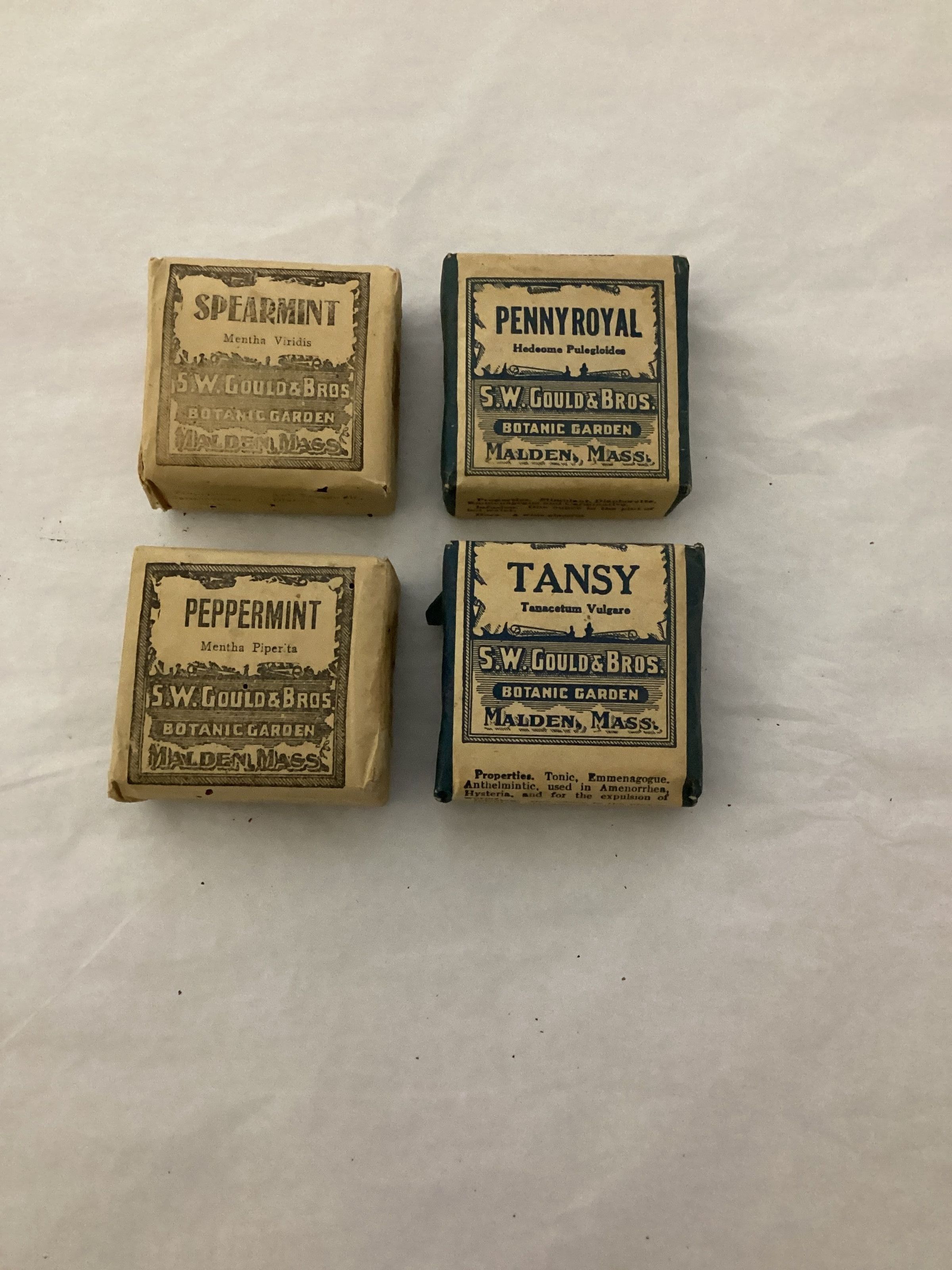 Packages of herbs marked with names, maker, latin name of plant, properties and dosage. Colors dark blue, tan and black. "S. W. GOULD & BROS. Botanic Grade, Malden Mass." printed on top side of package. Herbs used as medicines or tonics. Labeled A through D. Tansy A, Peppermint B, Spearmint C, Pennyroyal DCollection