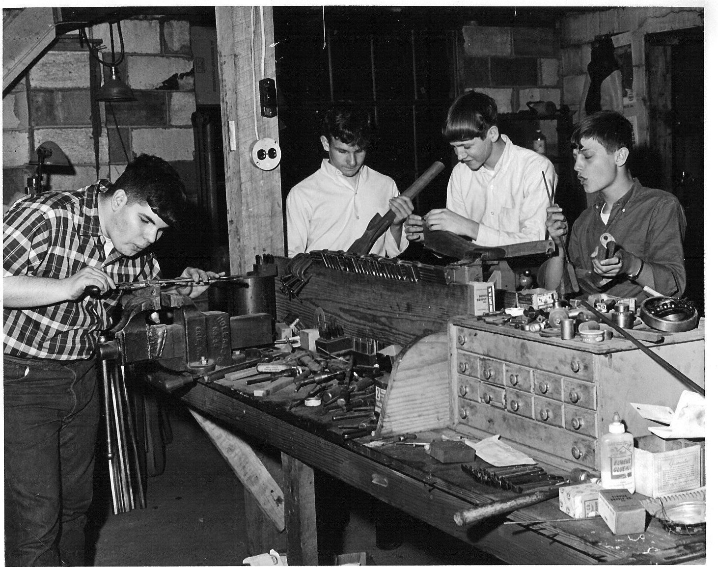 Four young men, one at left in plaid shirt/ working with a vice, 3 on other side, 2 in white shirts standing/ cabinets and tool in front/ cabinet has 14 knobs.Photograph Details
