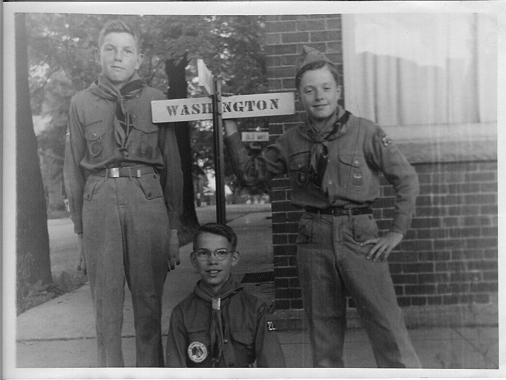 B&W photo; three boys standing by street sigh that reads "Washington" all are dressed in boy scout uniforms, boy to far left is standing with both arms at his side, boy in middle is wearing glasses ans sitting at base of sign, boy to fafr right is standing with one hand on his hip and the other on the sign, brick building in background.Photograph Details