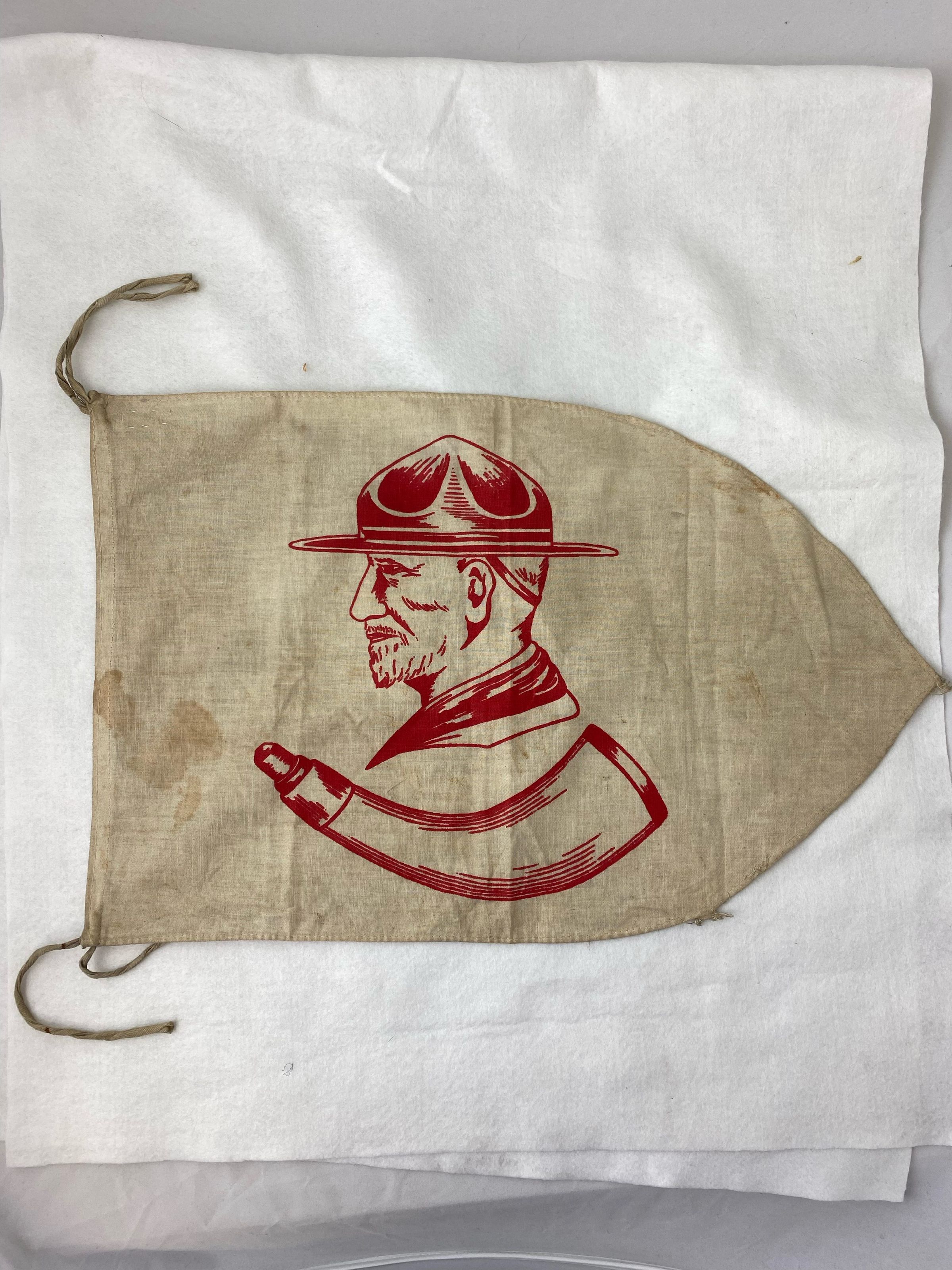 A small, beige muslin flag with design of a short-bearded and mustached man wearing a campaign hat and a kerchief around his neck. Beneath the man is an olifant / tusk horn / hunting horn. Both designs are in red and utilize beige negative space.Category