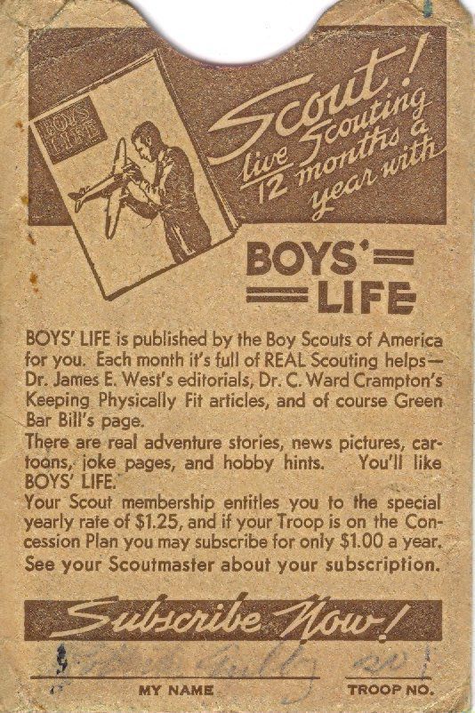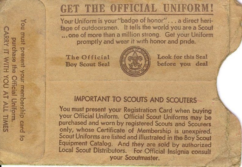 Envelope has BSA advertising on both sides. Front panel (vertical format) has advertising about the boy scout member being able to suscribe to the monthly publication BOYS' LIFE. Back panel (landscape format) has advertising, urging the boy scout member to order the official uniform.