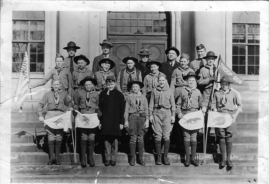 Black/white print - group of Boy Scouts and leaders with sponsors on steps of city hall. Boys in uniform on front row holding patrol flags. Boy on left in 2nd row holds American flag; boy on right holds Troop 204 flag, 7 boys on row 1; boy third from left not in uniform. 7 boys on row 2; third row has an adult leader on right and left side with 3 civilian dressed adults inbetween.