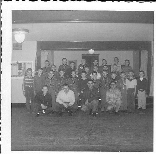 A black and white photographic print in snapshot format of four rows of young boys and men. Some of the boys are wearing Boy Scouts uniforms.Photograph Details