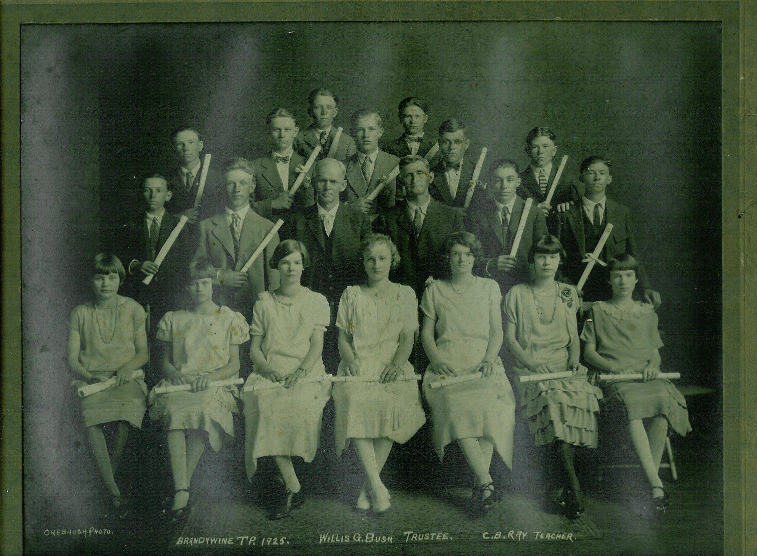 Donation, June, 1991. Graduation Class of Brandywine Township, 1925. Seven girls, 11 boys, the teacher, the trustee. Inscribed in white ink across the bottom of the photo: OREBAUGH PHOTO/BRANDYWINE TP. 1925/WILLIS G. BUSH TRUSTEE/C. B. RAY TEACHERCollection
