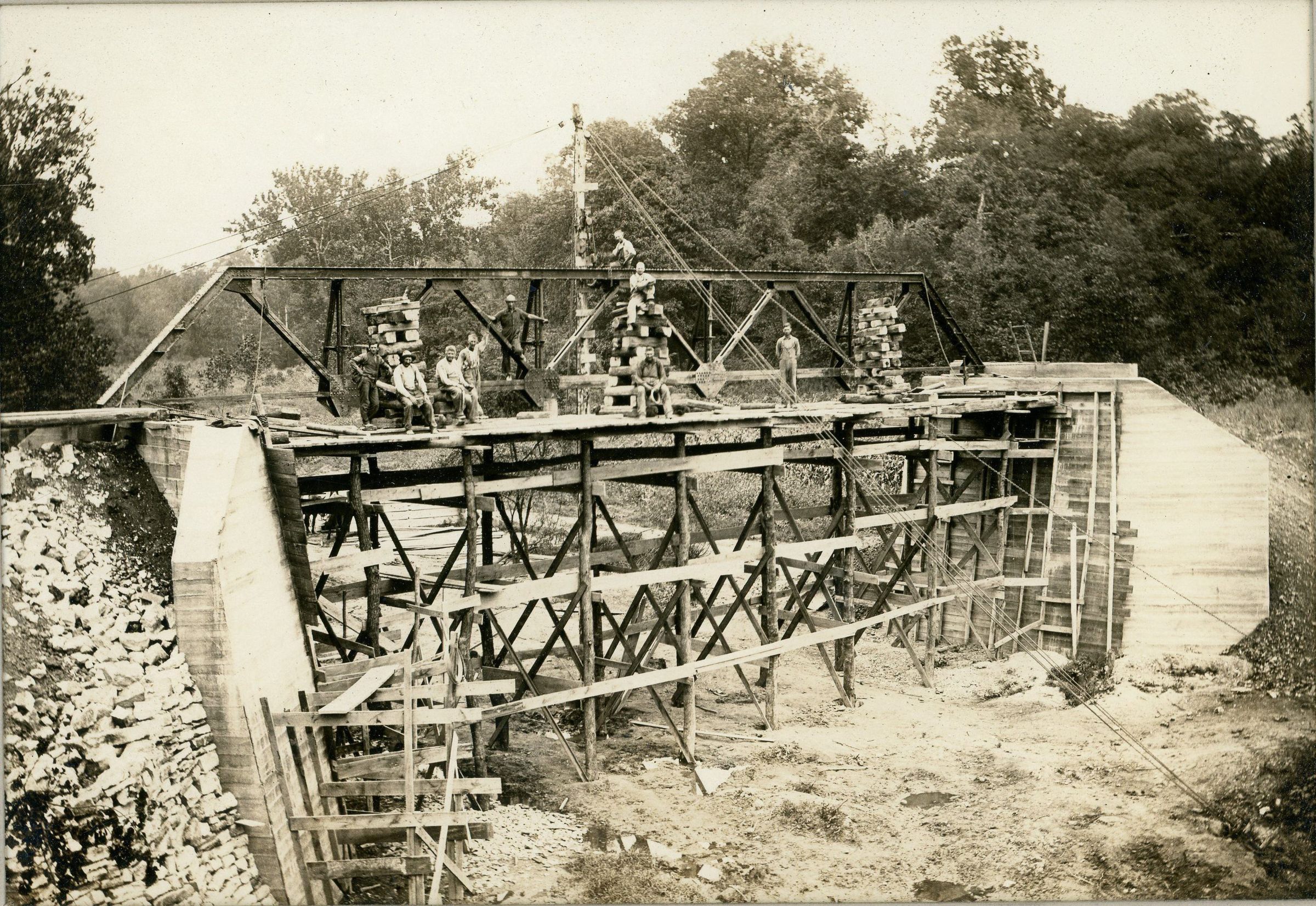 A sepia-toned photograph of workmen posed on scaffolding during the construction of a bridge.Photograph Details