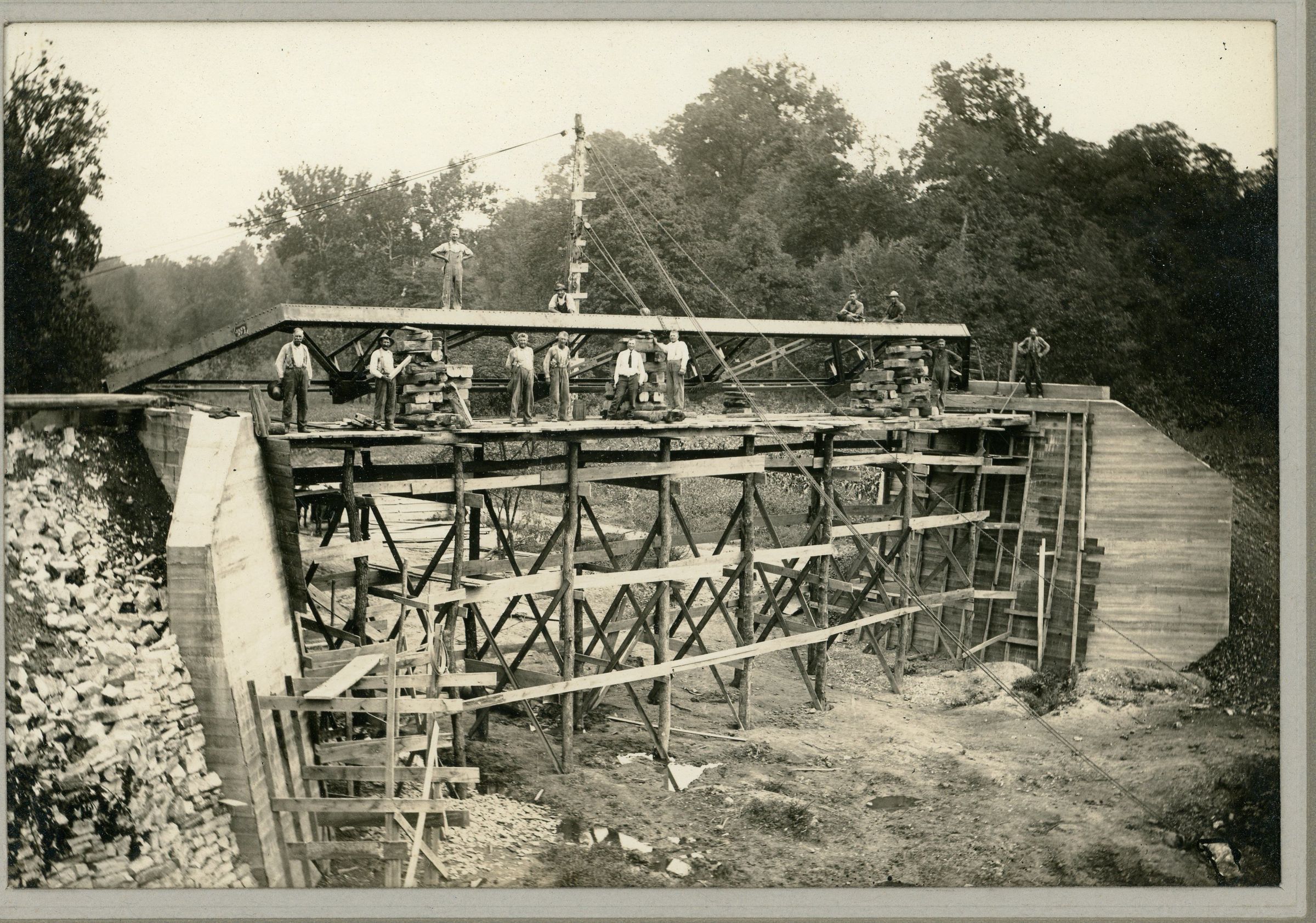 Black and white photograph of bridge construction with workmen posing on bridge floor.Photograph Details