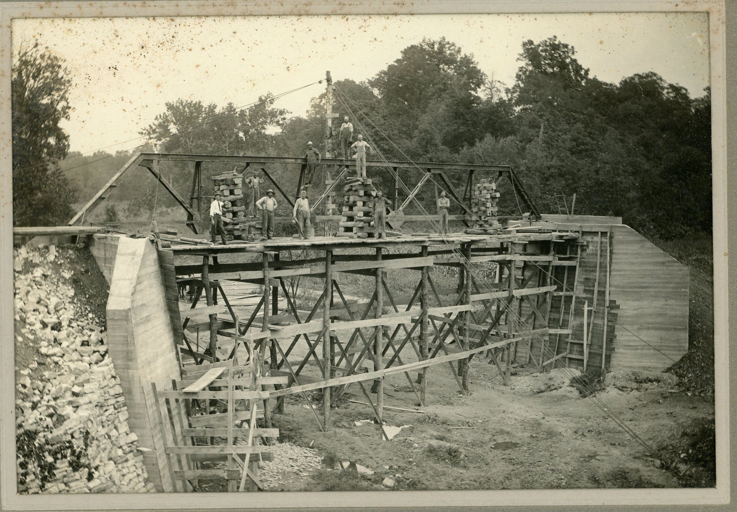 Black and white photograph of bridge under construction, showing the wood underpinnings, wood walls holding back earth and stone. 7 workmen posing on flooring of bridge.Photograph Details