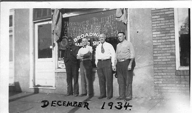 "December 1934". In ink on back: "December 1934./L-R Jim Brown (Shoe Shiner), Bert Davis/Clyde Rickey & Carl Crosby/East Broadway".Collection