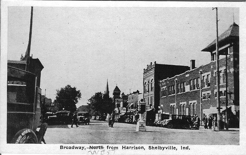 Donation, 07/26/2005. Black and white postcard in landscape format. Nothing is written on the back. At the bottom edge of the image: "Broadway, North from Harrison, Shelbyville, Ind." The word "North" has been crossed out with blue ink and the word "West" has been written in it's place. Alhambra Theater is on the right.Collection
