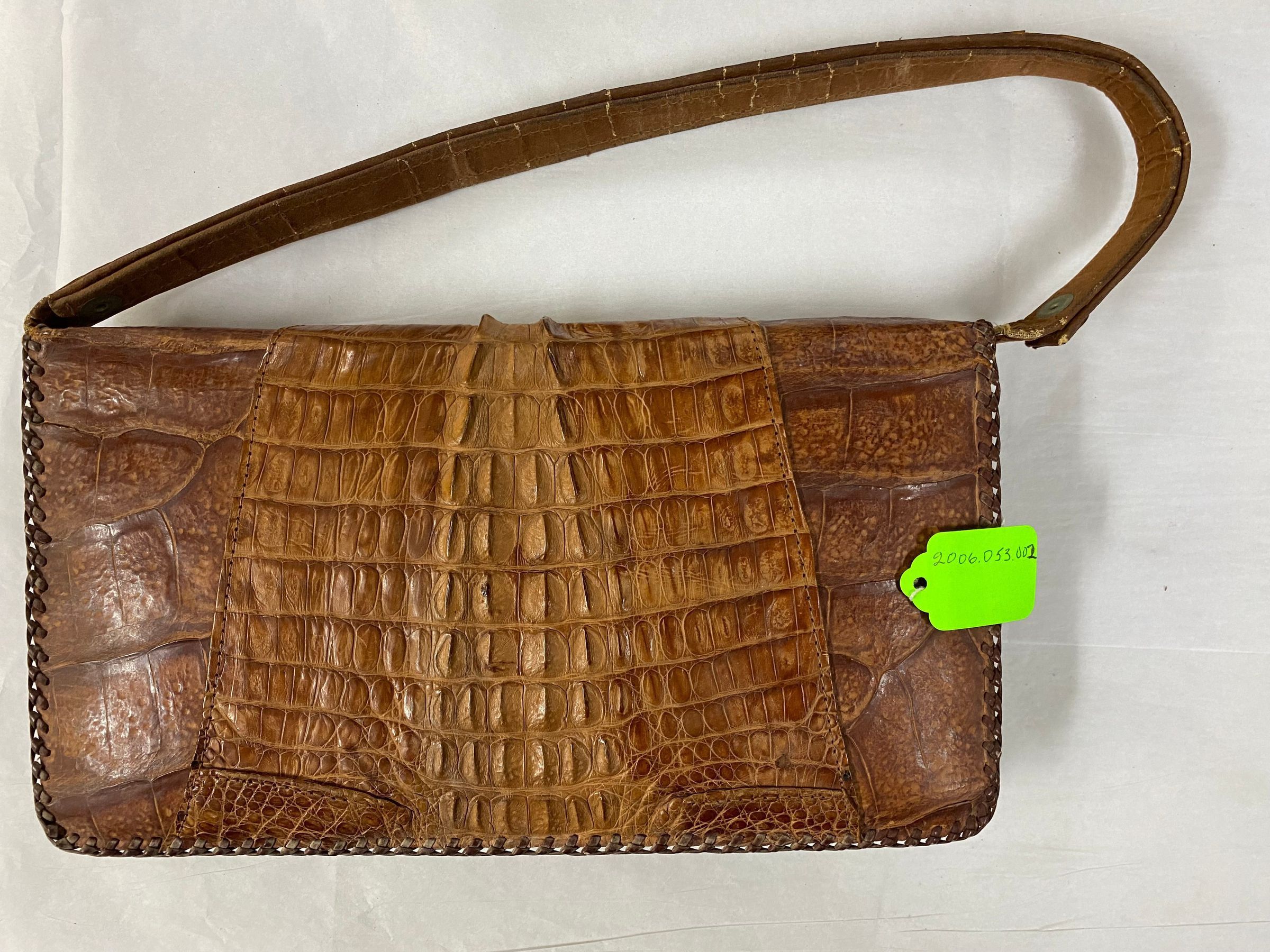 A brown leather purse made of alligator skin. The purse is rectangular with hand-stitched edges and has a brown leather strap. On the inside in gold type reads: Made in Cuba - Genuine Alligator.Acquisition