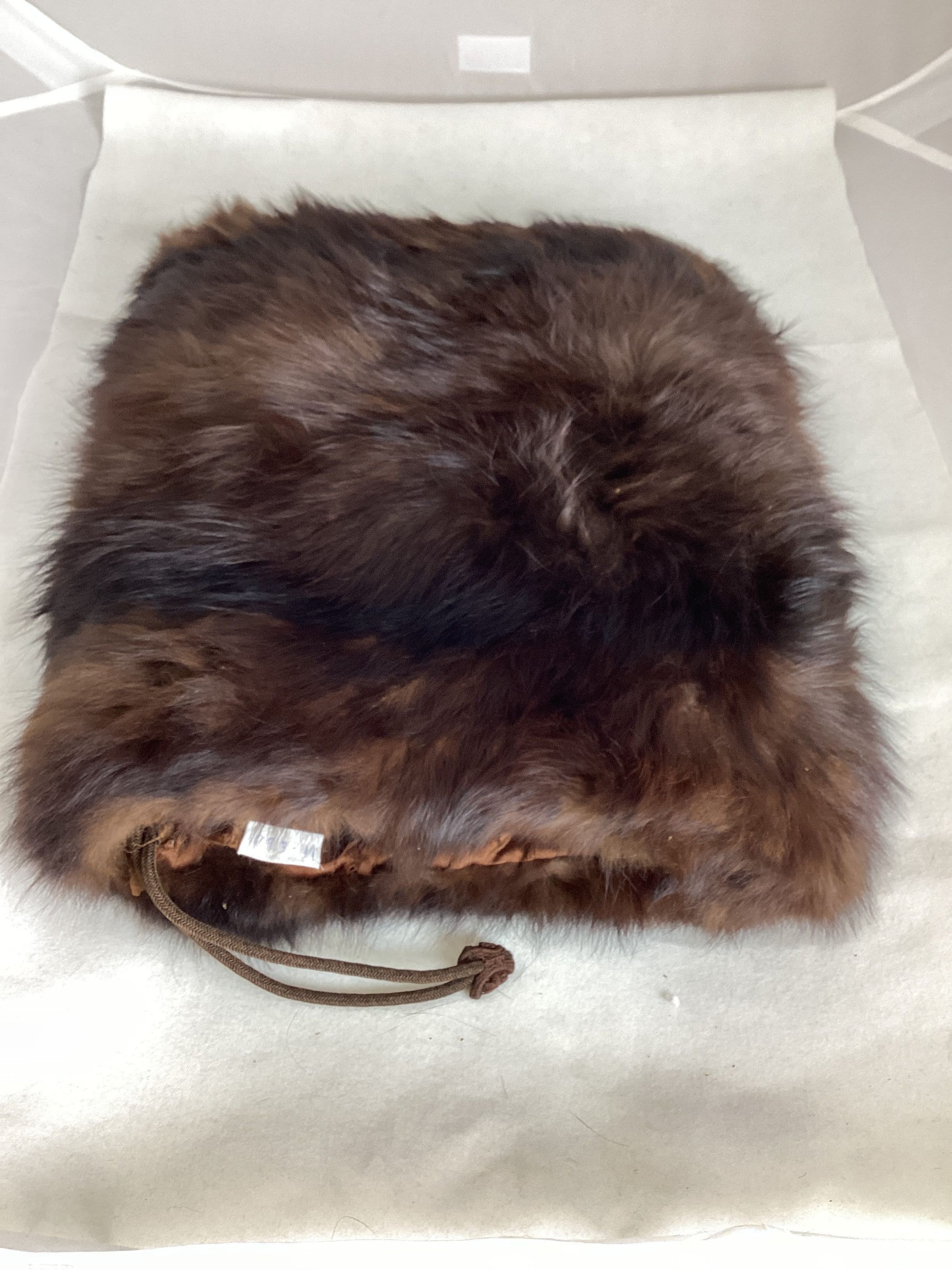 Muff, brown fur, lined w/ brown satin, brown cord hanger. Size: 14 x 16"Collection